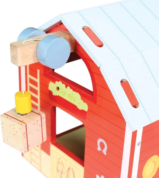 Praktický magnetický kladkostroj s lanem umožní dětem zvedat „balíky sena“ a přenášet je na půdu stodoly – realistická hra, která baví i učí.