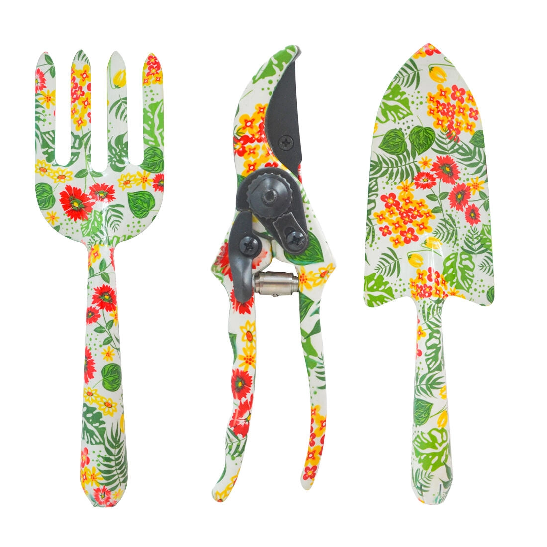 Elegantní 3dílná zahradní sada v bílé barvě s růžovým květinovým dekorem pro každodenní péči o rostliny. Obsahuje kypřič půdy, ruční lopatku a zahradní nůžky, vše v praktickém dárkovém balení. Ideální pro přesazování, kypření, pletí a zastřihování rostlin.