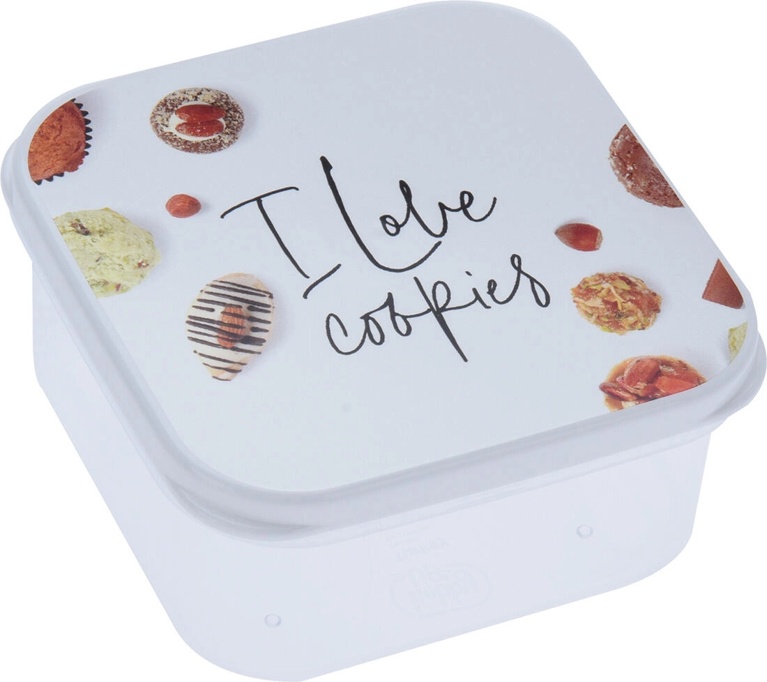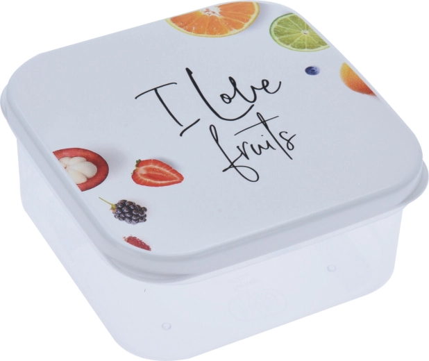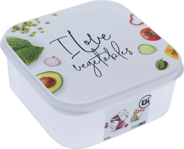 Stylová sada čtyř čtvercových dóz s víčky pro každodenní uchovávání potravin. Díky těsnícím víčkům, praktickým velikostem a stohovatelnému tvaru udrží vše čerstvé a přehledné. Dózy jsou vyrobené z BPA free plastu a zdobí je hravé motivy ovoce, zeleniny, makronek a sušenek.