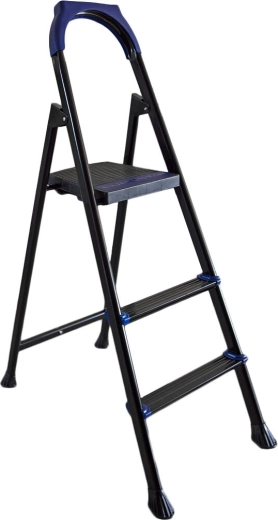 Schůdky mají kompaktní rozměry po rozložení 40 × 71 × 109 cm a moderní provedení v černé barvě s modrými plastovými prvky, které se hodí do každého interiéru.