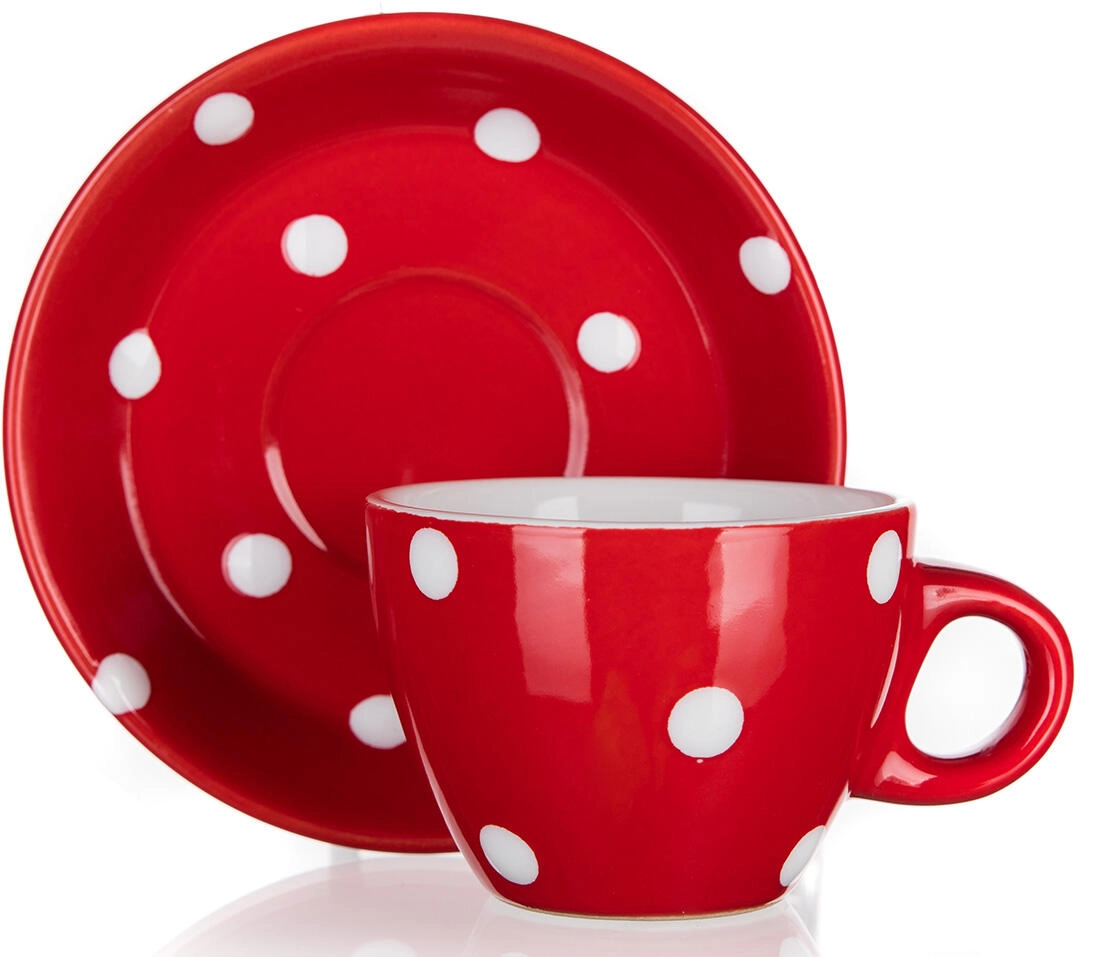 Stylový keramický šálek s podšálkem o objemu 100 ml v červené barvě s bílými puntíky potěší každodenním používáním. Díky odolnému materiálu je vhodný do mikrovlnné trouby i myčky nádobí, takže si svou oblíbenou kávu či espresso vychutnáte pohodlně a bez starostí.