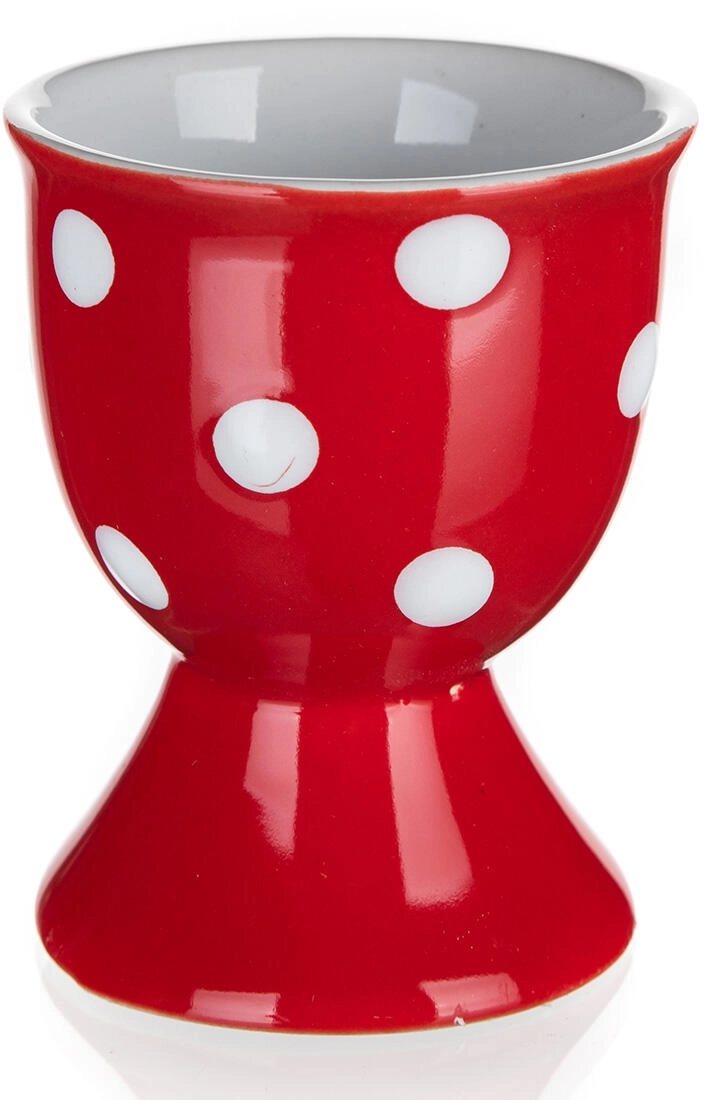 Veselý keramický kalíšek na vajíčko v červené barvě s bílými puntíky je praktickým i dekorativním doplňkem pro každodenní snídaně. Díky výšce 7 cm pohodlně podrží slepičí vajíčko a dodá prostřenému stolu šmrnc.