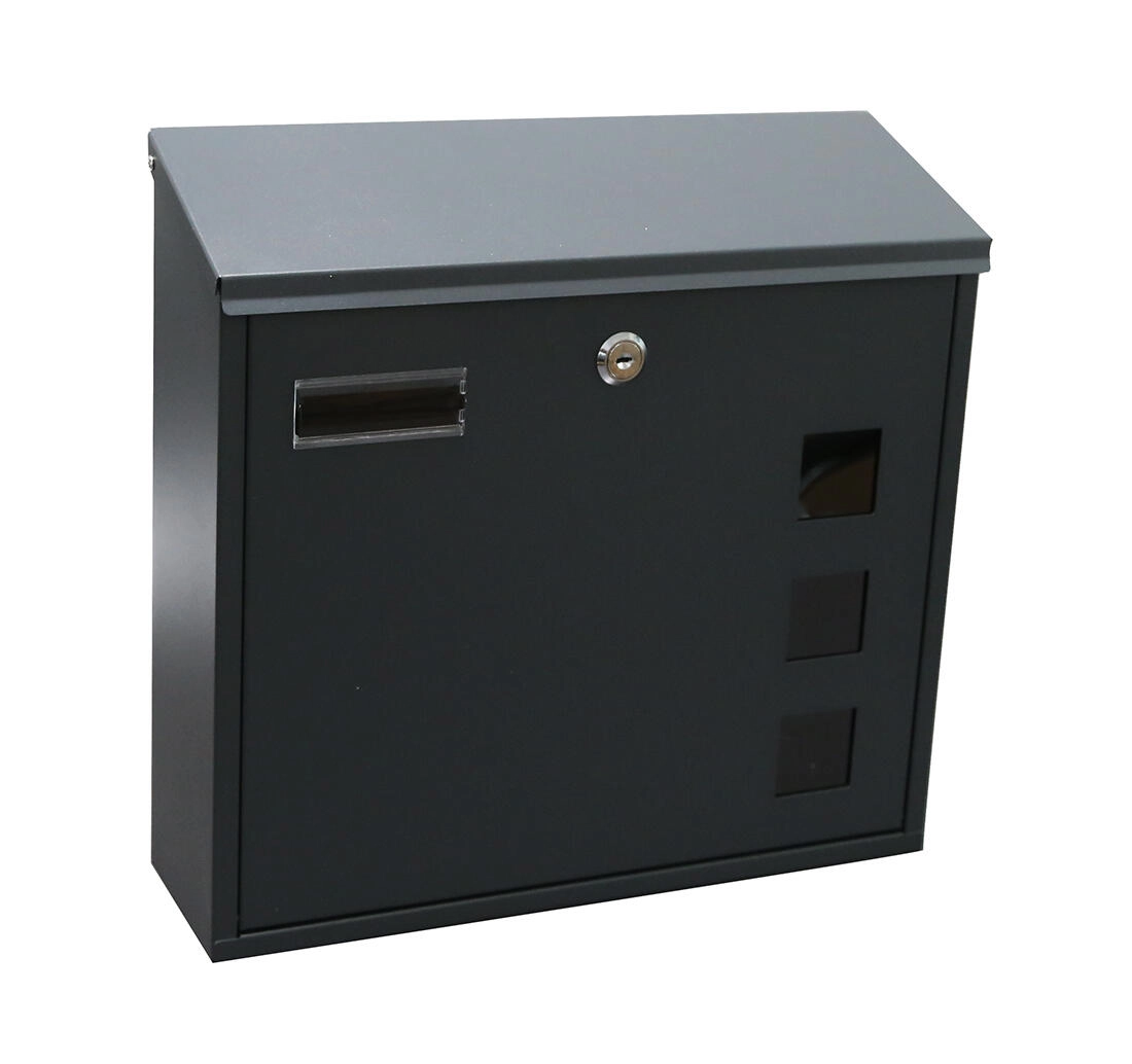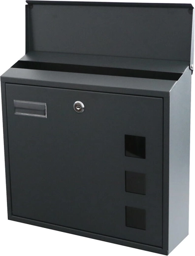 Praktická venkovní poštovní schránka v elegantní barvě antracit s rozměry 350 × 330 × 110 mm. Nabízí horní vhoz, přední dvířka na klíč pro snadné vyzvedávání pošty a jednoduchou montáž skrz zadní stěnu. Součástí balení jsou šroubky a hmoždinky, nechybí ani cylindrický zámek se 2 klíči a průhledná jmenovka.