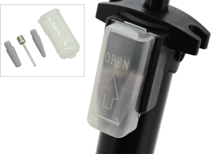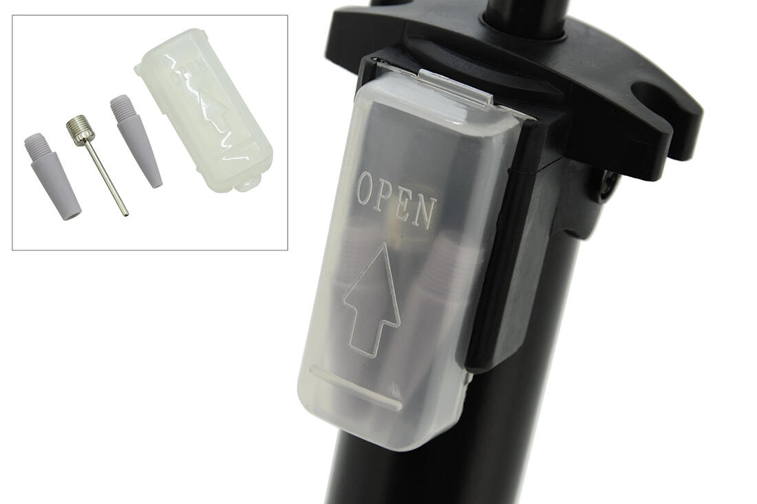 Díky dvojitému adaptéru na hadici je kompatibilní s automobilovým i cyklistickým (galuskovým) ventilkem. Přímo na těle hustilky najdete praktickou schránku s adaptéry pro nafukování míčů, matrací či bazénů. Stabilitu při práci zvyšuje opěra na nohu a snadné ovládání zaručuje ergonomicky tvarovaná rukojeť.