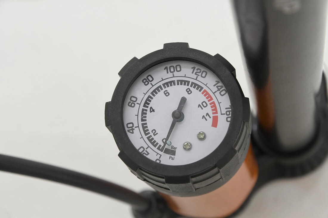 - Integrovaný manometr – přesná kontrola tlaku při huštění.