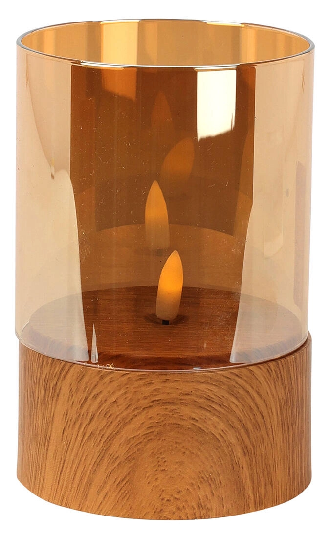 Tato stylová LED svíčka s průměrem 10 cm a výškou 15 cm vyniká přírodním vzhledem dřeva a teplým nádechem jantarového skla. Díky efektu blikajícího plamene věrně napodobuje klasickou svíčku, ale bez kouře, sazí a rizika otevřeného ohně.