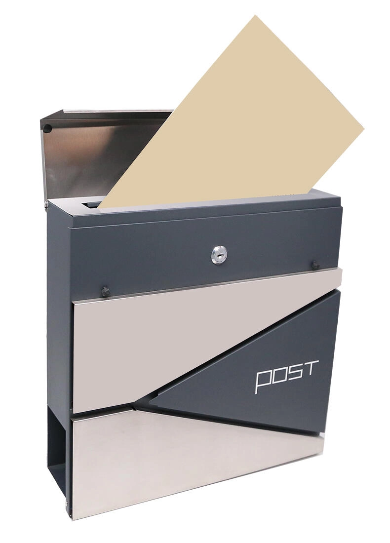 Elegantní a odolná poštovní schránka z kombinace pozinkované oceli a nerezu je ideální pro venkovní použití. Nabízí vhoz shora, tubus na noviny ve spodní části a je vhodná pro formát A4. Součástí je cylindrický zámek se 2 klíči a snadná montáž díky přiloženým šroubům a hmoždinkám.