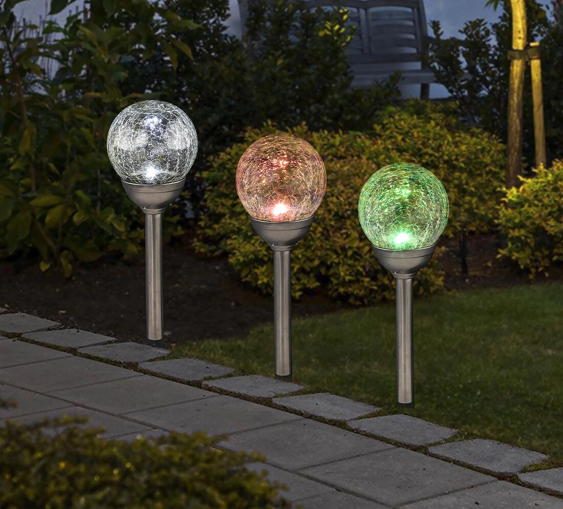 Stylová solární lampa ve tvaru koule s průměrem 12 cm a výškou 42,5 cm přináší úsporné osvětlení bez kabelů. Díky 2 čirým LED nabízí dvě funkce svícení – studené bílé nebo měnící se barevné světlo. Odolné provedení z nerezové oceli, skla a čirého plastu s krytím IP44 je ideální na zahrady, terasy i cesty.