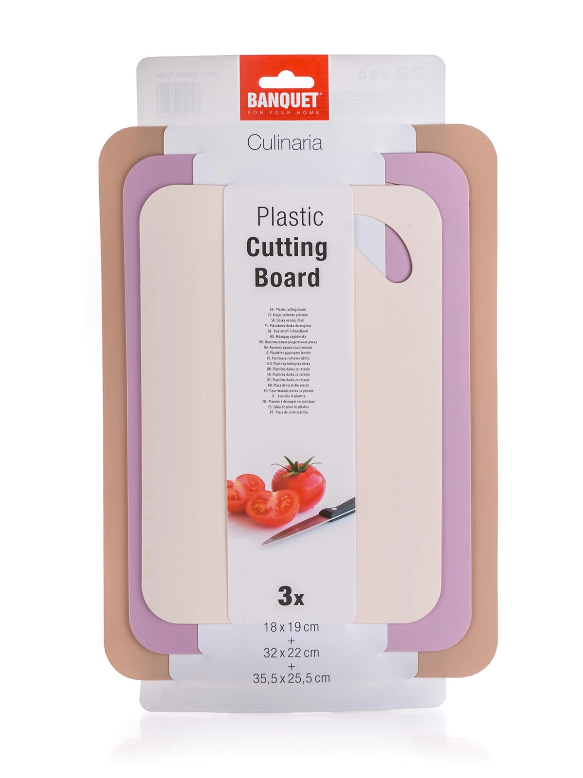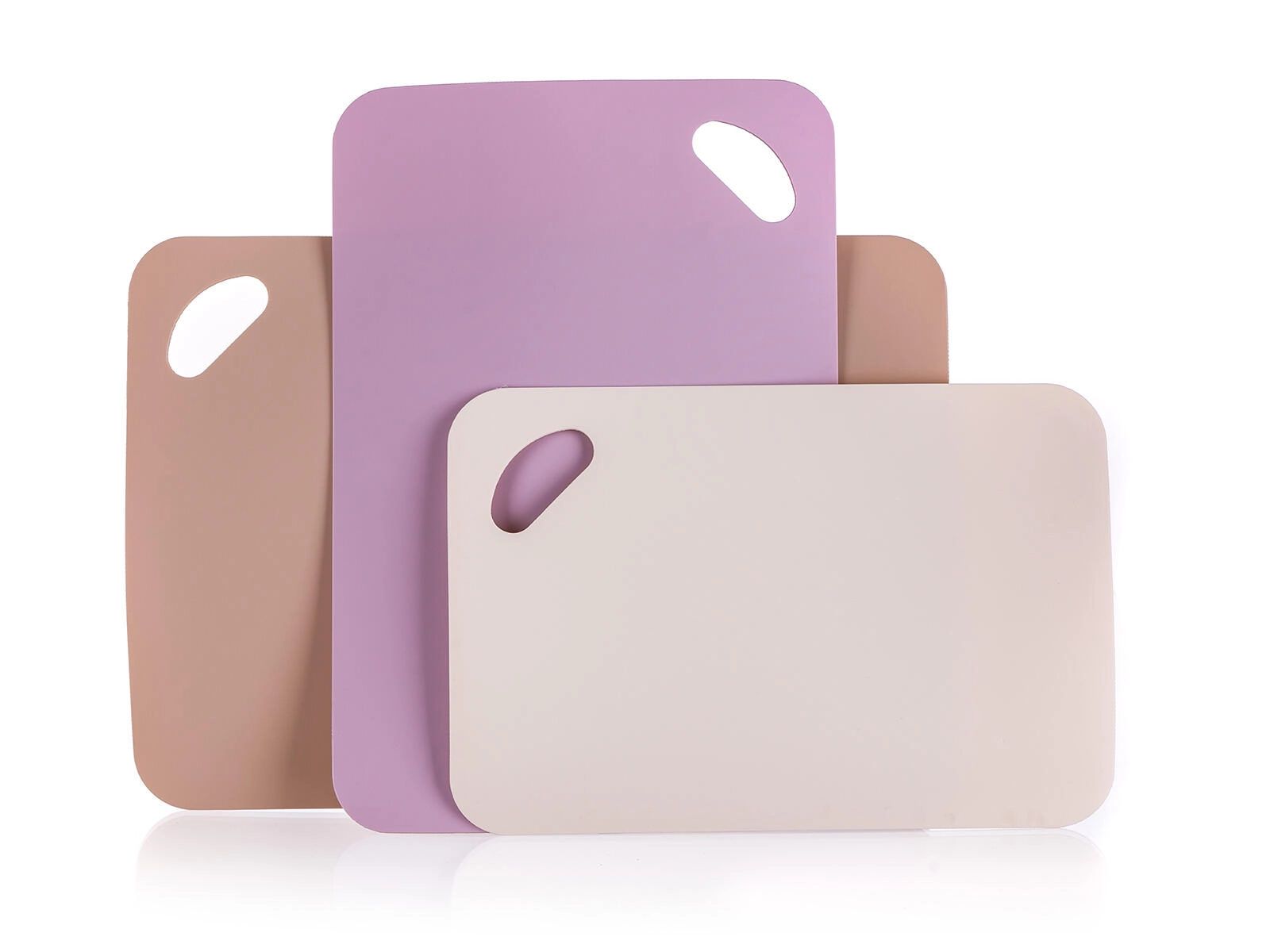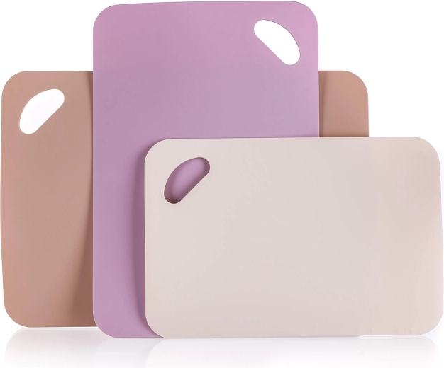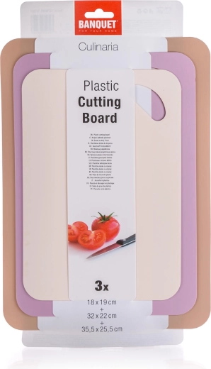 Praktická sada tří krájecích prkének pro každodenní vaření. Různé velikosti a protiskluzový povrch zajistí bezpečné krájení, odolný plast se snadno čistí a otvory pro zavěšení usnadňují skladování. Elegantní mix barev béžová, hnědá a fialová doladí vaši kuchyň.