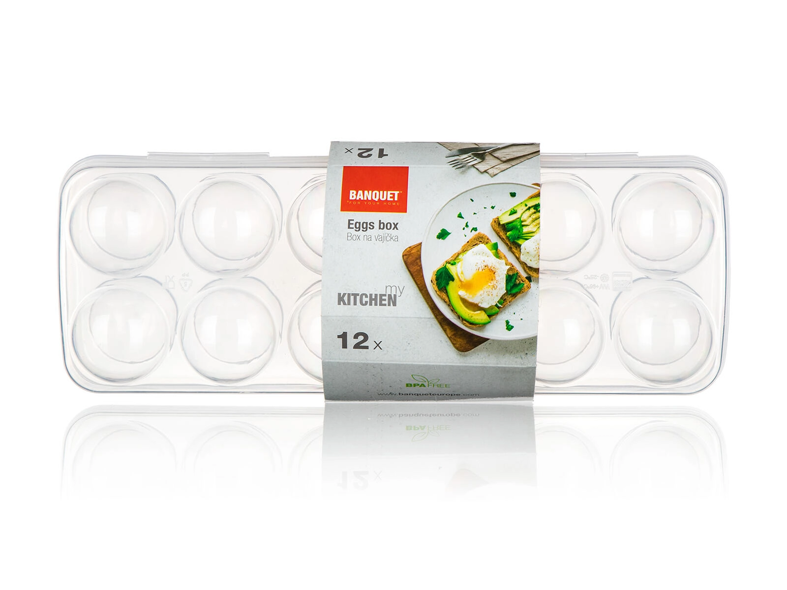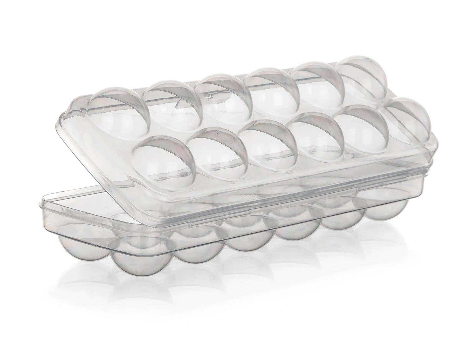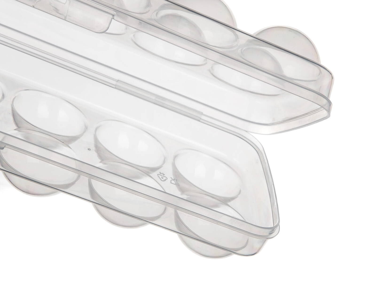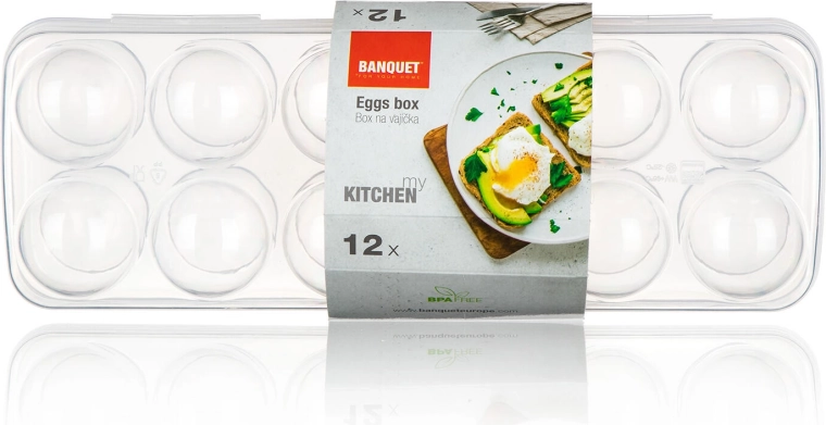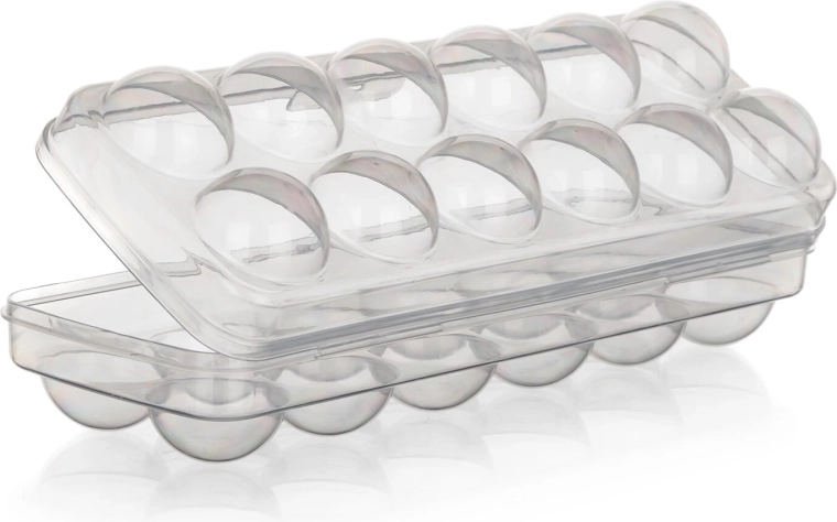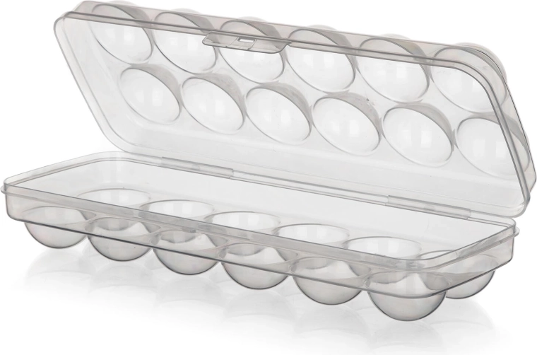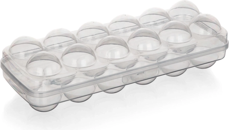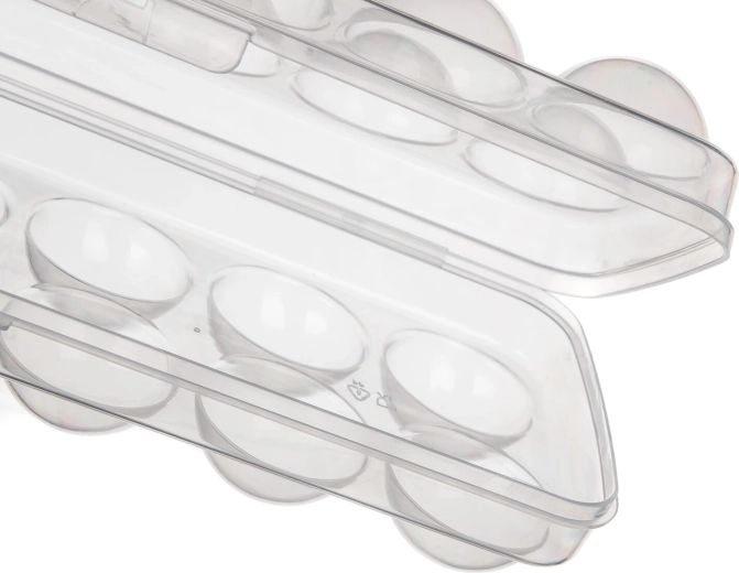 Ergonomicky tvarované jamky zabraňují kutálení a prasknutí vajec. Nízký profil a rovné víko umožňují snadné stohování v lednici i v její dvířkové přihrádce, takže šetří místo a zajišťuje pořádek.