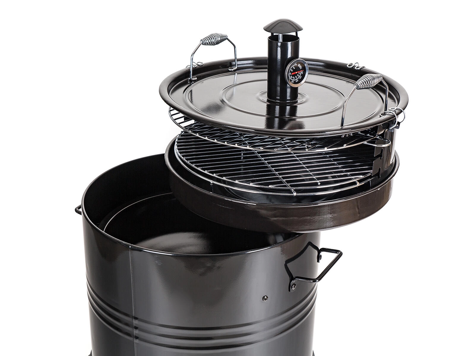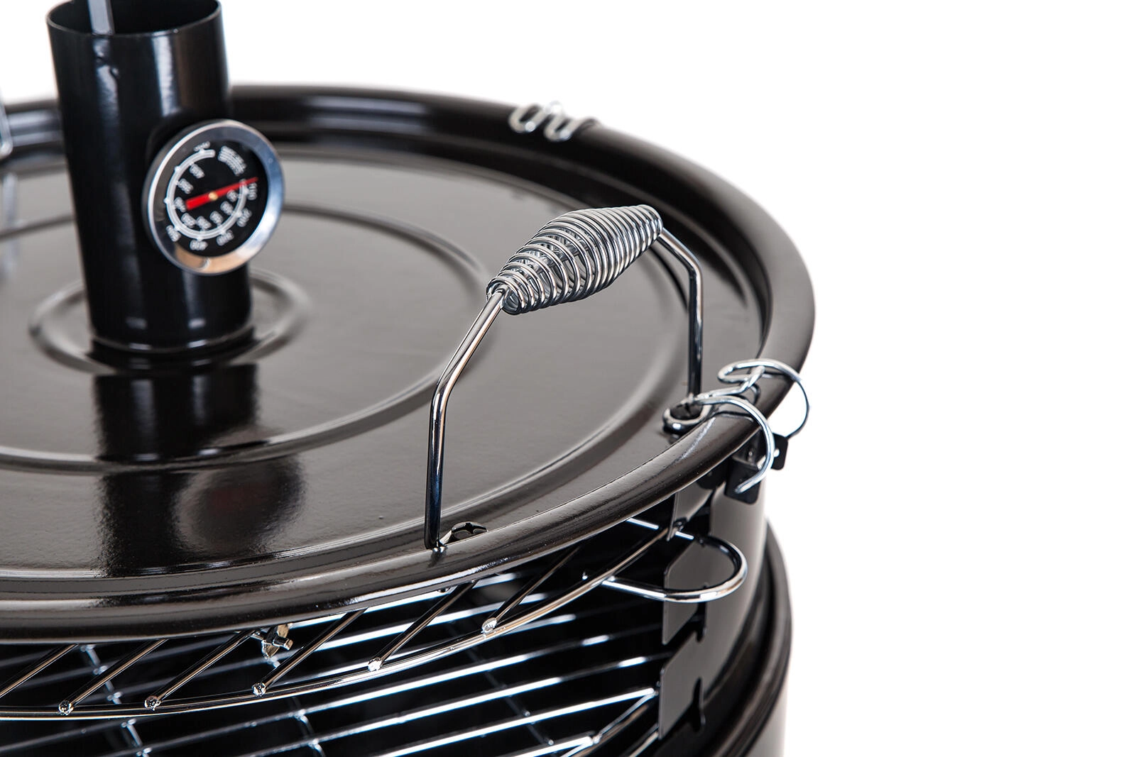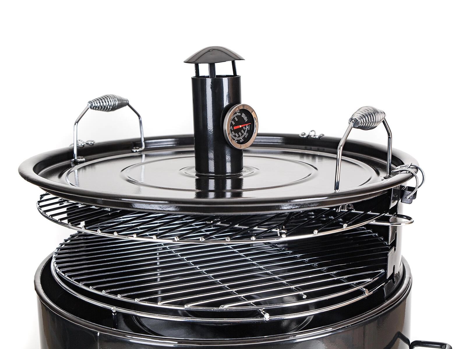 Dva kruhové rošty o průměru 42,5 cm poskytují dostatek prostoru pro rodinné grilování i pomalé uzení. Odolné ocelové tělo v černé barvě, ergonomické rukojeti a promyšlené větrací otvory usnadňují obsluhu, čištění i bezpečnou manipulaci.