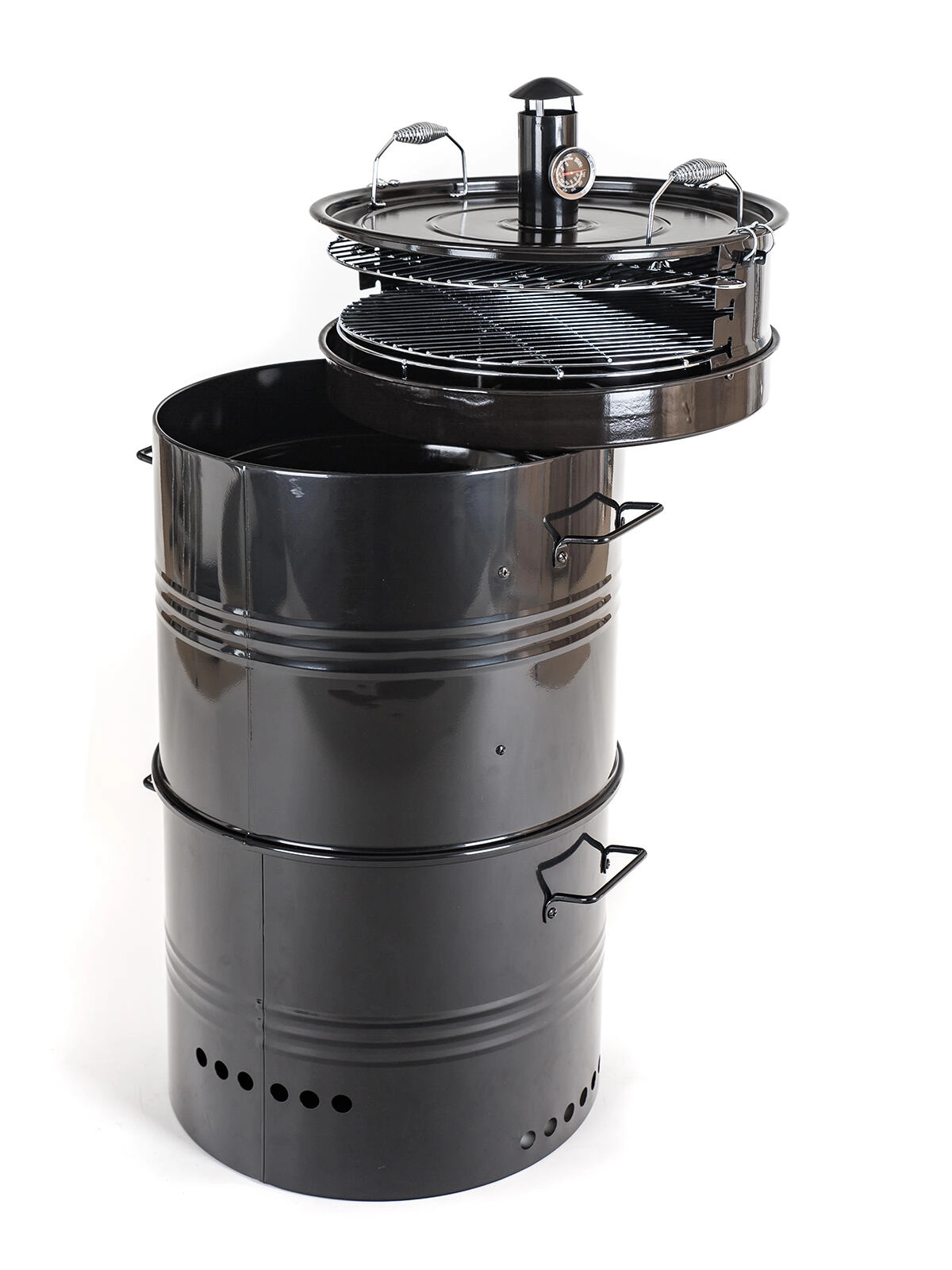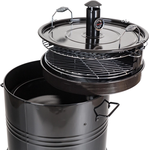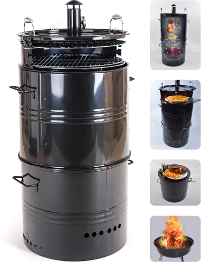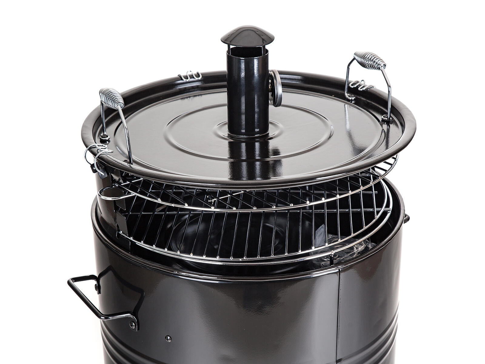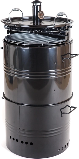 Dva kruhové rošty o průměru 42,5 cm poskytují dostatek prostoru pro rodinné grilování i pomalé uzení. Odolné ocelové tělo v černé barvě, ergonomické rukojeti a promyšlené větrací otvory usnadňují obsluhu, čištění i bezpečnou manipulaci.