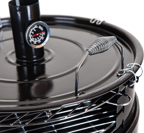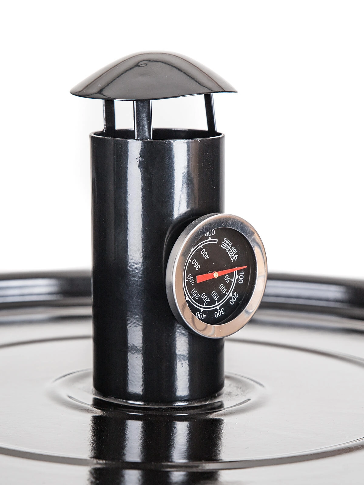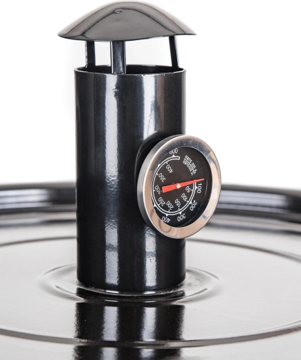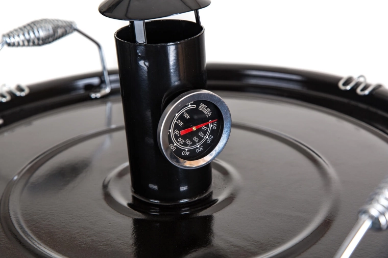 Komínek s nastavitelným tahem a vestavěný analogový teploměr v poklici vám dají plnou kontrolu nad žárem a stabilní teplotou při uzení i grilování.