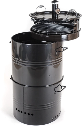 Univerzální venkovní gril a udírna GRIMSBY kombinuje kouření, grilování, pečení i vaření v jednom těle. Díky variabilním, stohovatelným sekcím, průměru roštu 42,5 cm, komínku s regulací tahu a vestavěnému teploměru snadno připravíte šťavnaté steaky, pomalu uzená masa i křupavou pizzu nad vodní lázní či otevřeným ohněm.