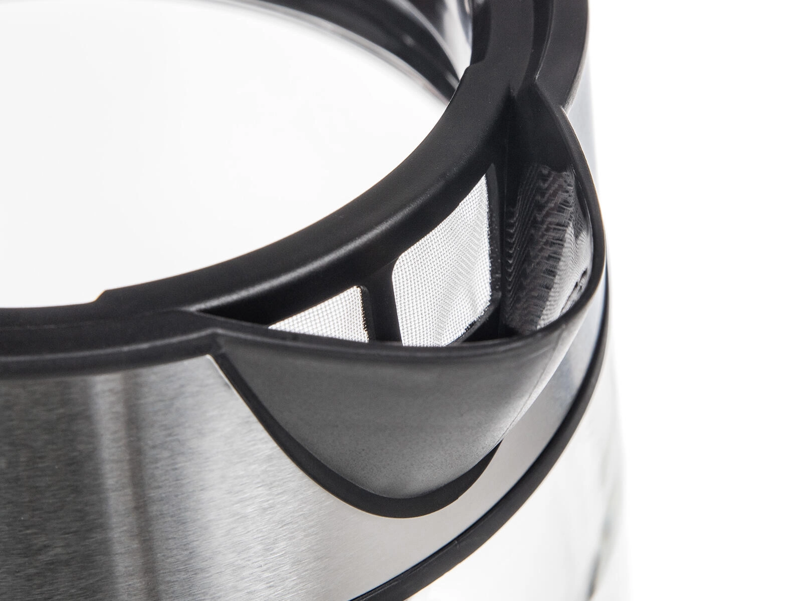 Jemný filtr zachytí usazeniny a lze jej snadno vyjmout a omýt. Široké víko zjednodušuje plnění i čištění vnitřku konvice.