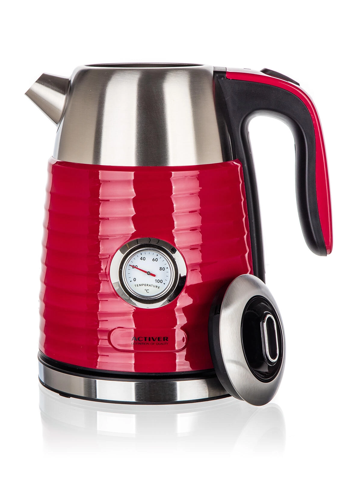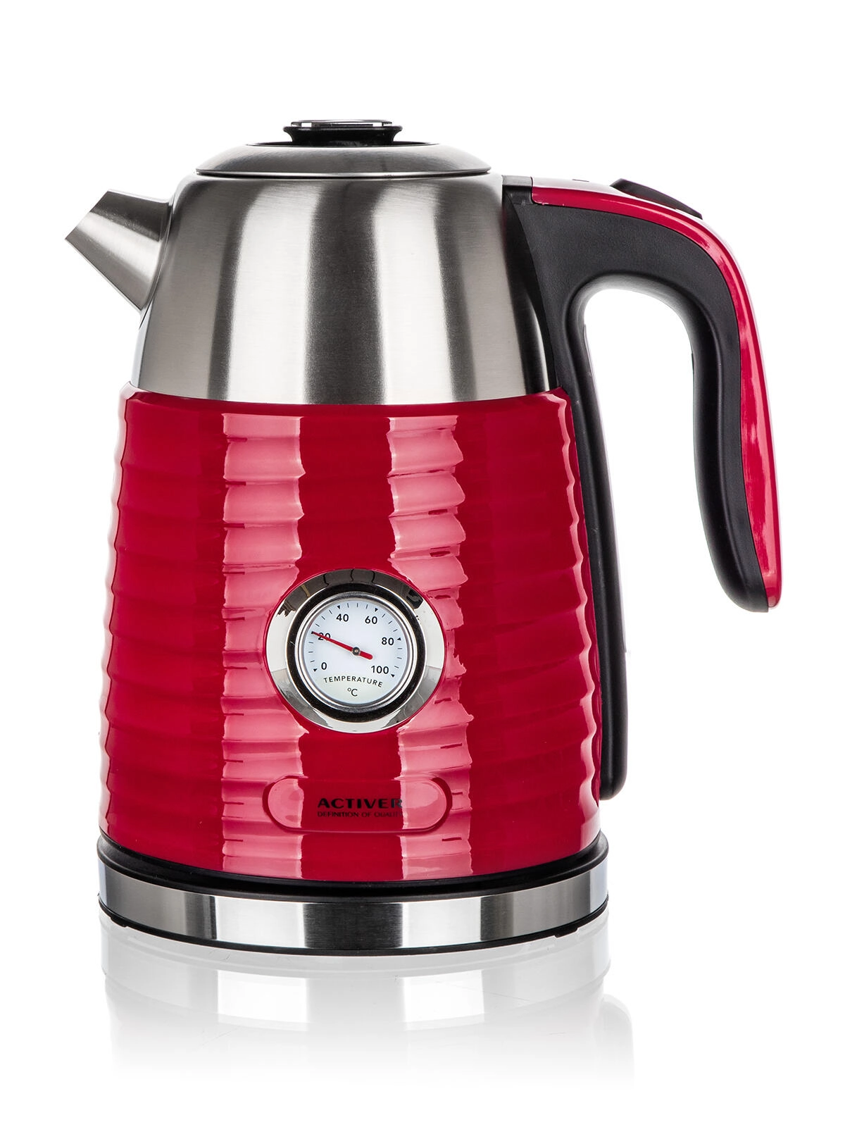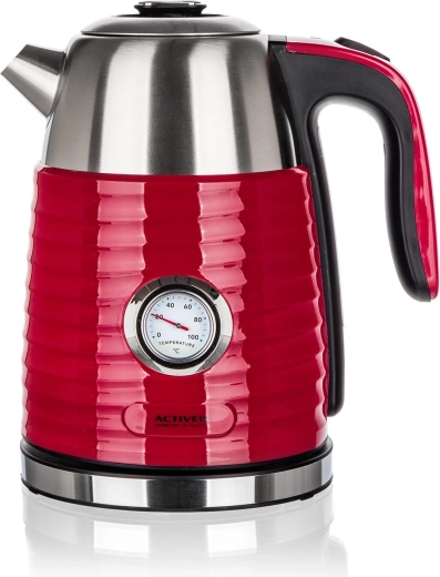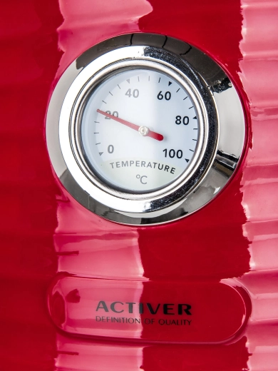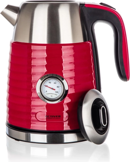 Rychlovarná konvice JUMPER s objemem 1,7 l spojuje elegantní červené provedení s praktickým nerezovým vnitřkem. Dvoustěnná konstrukce omezuje riziko popálení při náhodném dotyku, zároveň lépe udržuje vodu déle teplou pro postupné servírování. Integrovaný analogový teploměr vám umožní přesně sledovat teplotu vody – ideální pro přípravu jemných čajů, kávy či instantních nápojů.