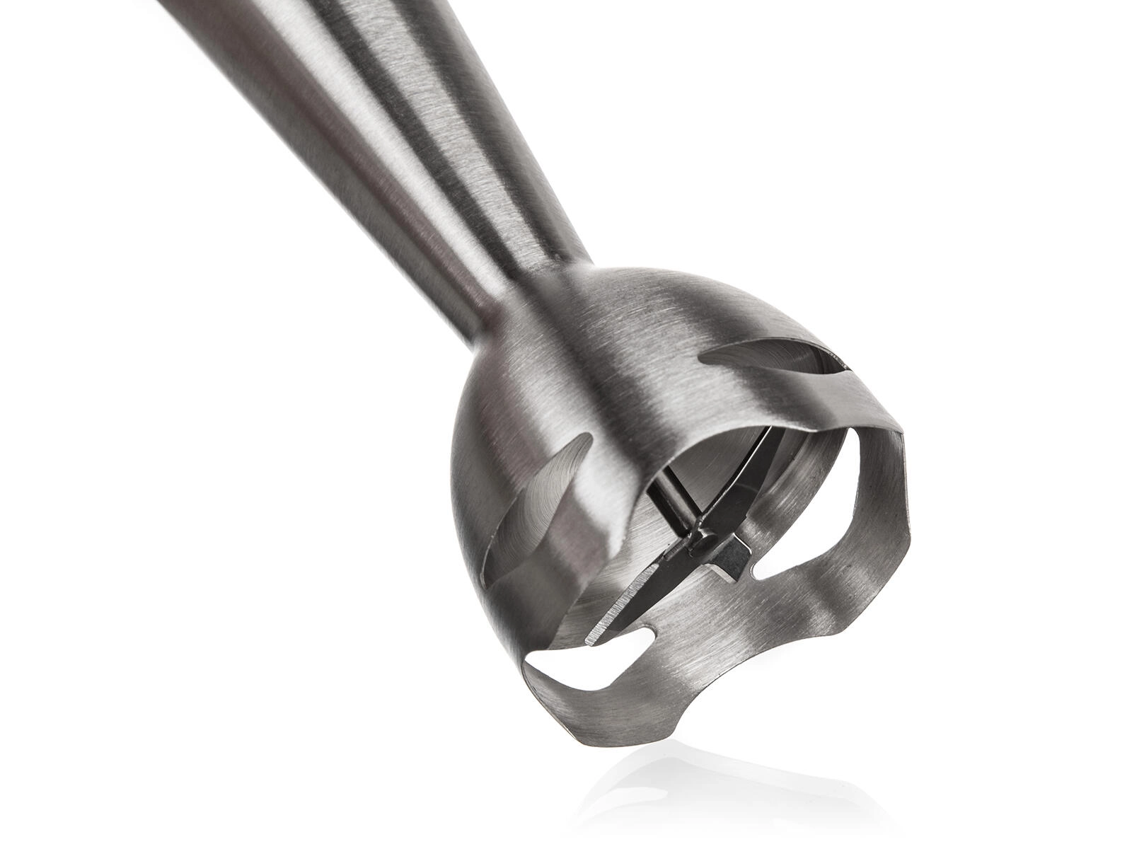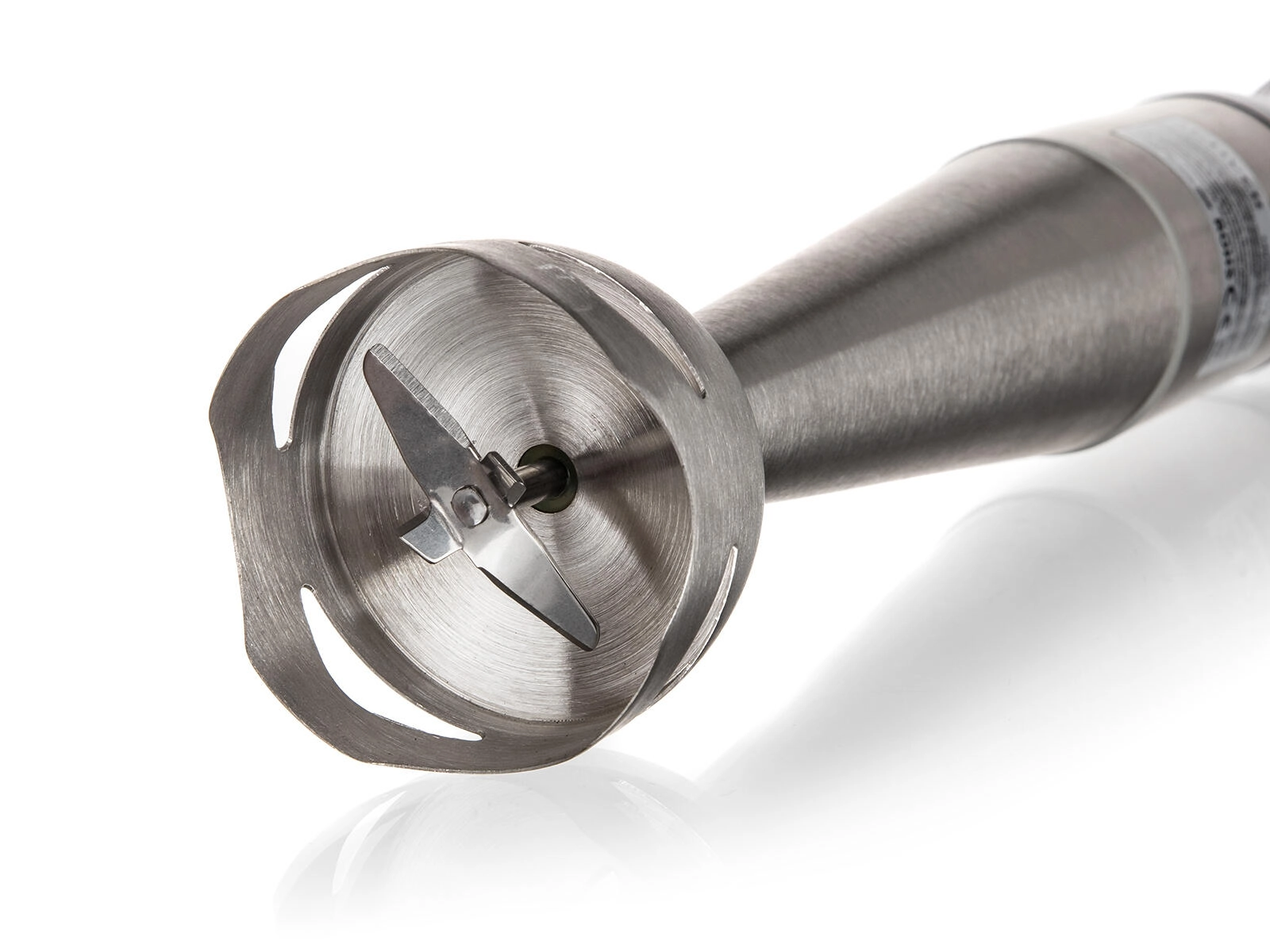 Robustní nerezový nástavec s ochranným zvonem minimalizuje rozstřikování a lze jej snadno sejmout a umýt.