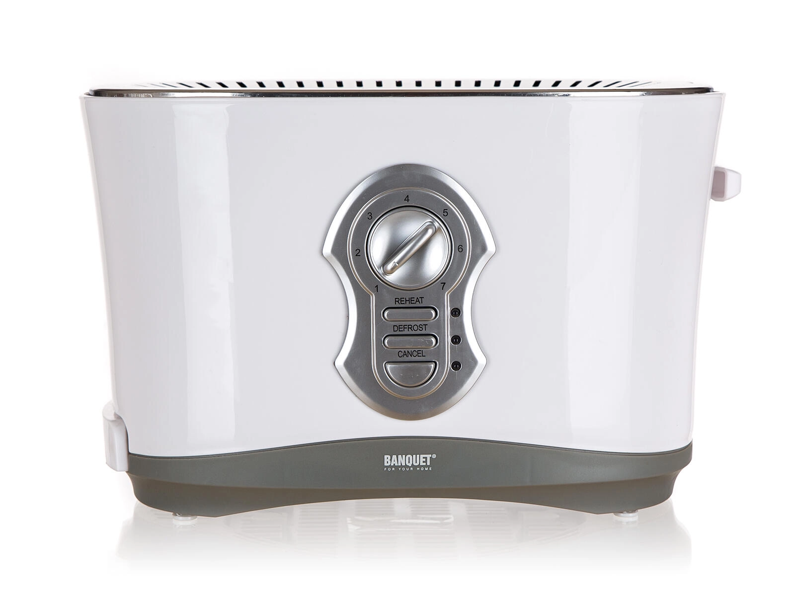 Praktické funkce Defrost (rozmrazování) a Reheat (opakovaný ohřev) zajistí perfektní výsledek i u mraženého pečiva nebo dříve připravených toustů. Tlačítko Cancel umožní okamžité přerušení cyklu, automatické vypnutí a světelný indikátor přidávají na bezpečnosti a pohodlí. Centrování plátků a výsuvná miska na drobky usnadňují každodenní používání i čištění.