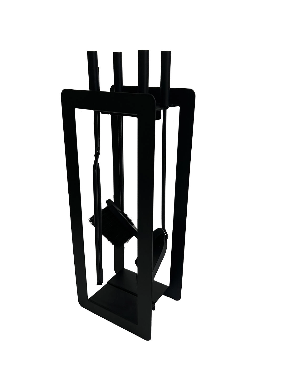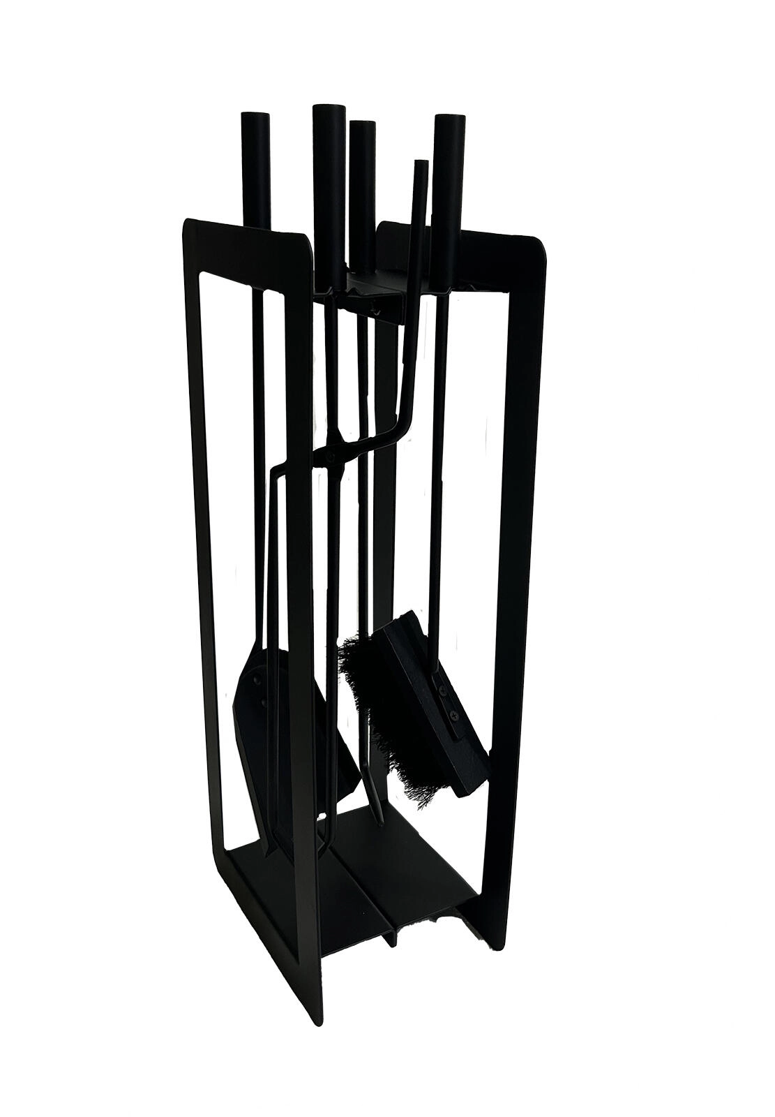 Otevřený kovový stojan drží náčiní stále po ruce a udržuje prostor kolem krbu čistý a upravený.