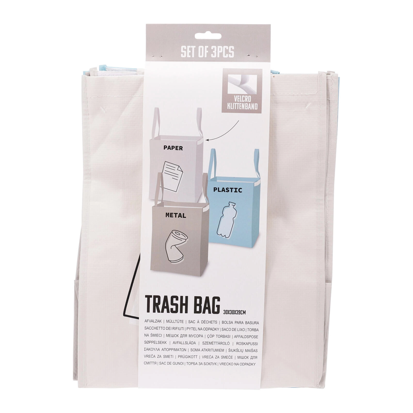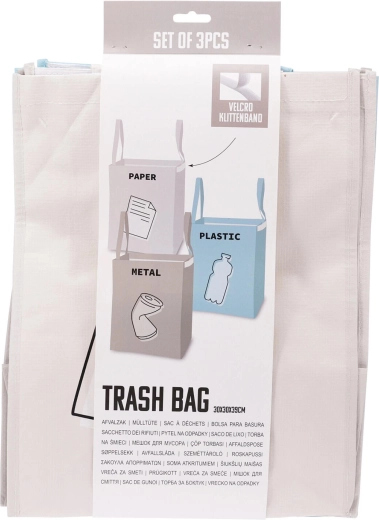 Praktická sada tašek na tříděný odpad pro domácnost i kancelář. Každá taška má kompaktní rozměry 30 × 30 × 39 cm a je označena na PAPÍR, PLAST a KOV. Lze je používat samostatně nebo je snadno spojit suchým zipem do stabilního celku pro přehledné a efektivní třídění odpadu.