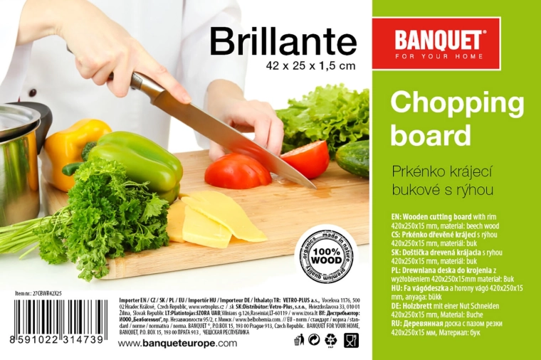 Dřevěné krájecí prkénko BRILLANTE je vyrobeno z odolného bukového dřeva v natur provedení. Díky praktické drážce po obvodu zachytí tekutiny a udrží pracovní plochu čistou. Rozměr 42 × 25 cm poskytuje dostatek místa pro pohodlnou přípravu masa, zeleniny i pečiva.