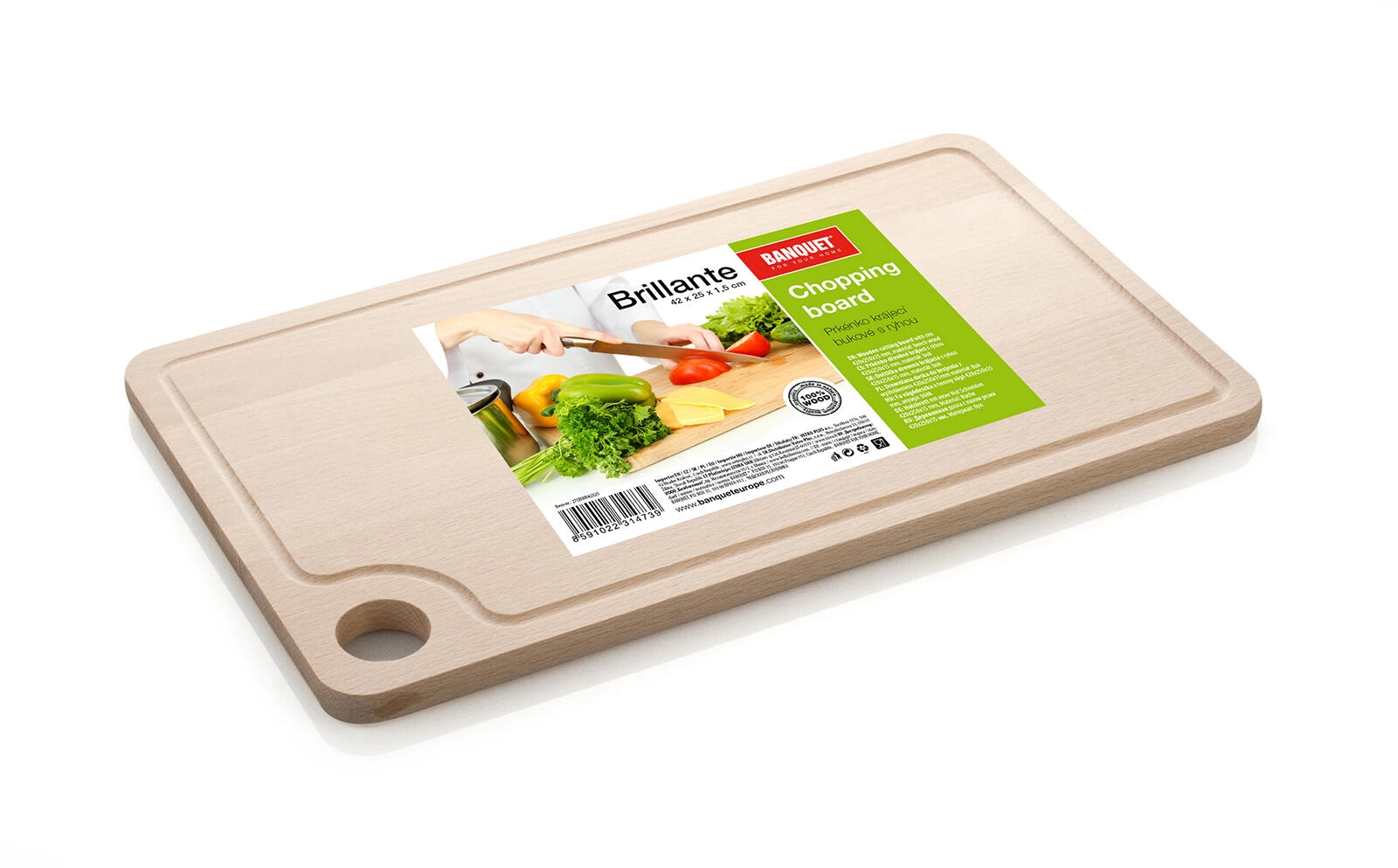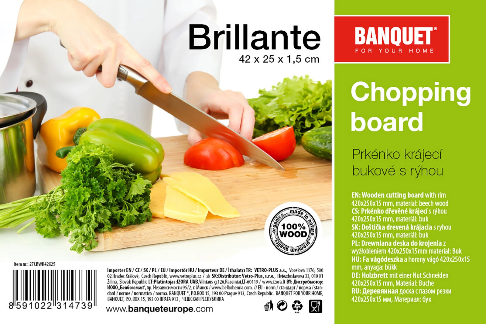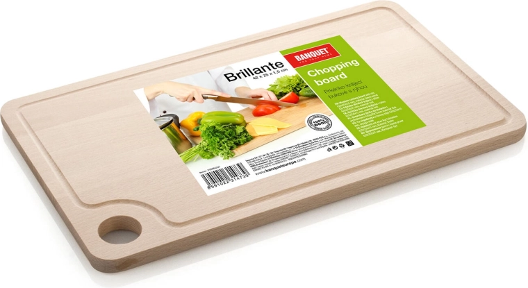 Praktické dřevěné krájecí prkénko BANQUET BRILLANTE o rozměrech 42 × 25 cm z bukového dřeva nabízí kvalitní zpracování a drážku po obvodu pro zachycení šťáv. Ideální pro každodenní krájení i servírování s přírodním vzhledem a dlouhou životností.