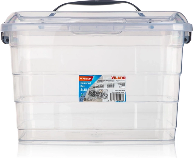 Úložný box VILARD s objemem 8,5 l přináší všestranné využití pro domácnost, kancelář i dílnu. Průhledné provedení umožňuje rychlou orientaci v obsahu, zatímco víko s klipy udrží vše bezpečně na místě. Praktické madlo usnadní přenášení třeba mezi místnostmi nebo při cestách.