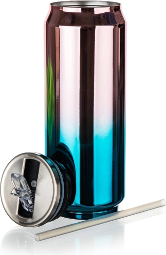 Průhledné víčko s pítkem a přiložené brčko umožní bezpečné a komfortní pití i na cestách. Povrch v atraktivním duhovém zlatorůžovo‑modrozeleném provedení je nejen moderní, ale také odolný a snadno se udržuje.