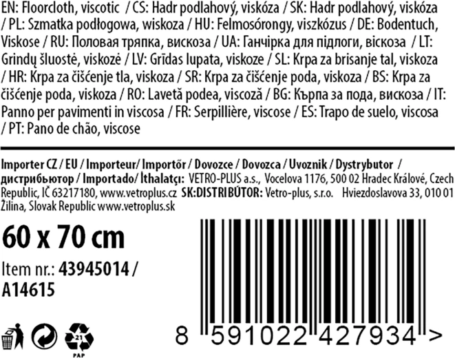 Tento univerzální hadr na podlahu je ideální pro každodenní úklid v domácnosti i kanceláři. Díky materiálu z viskózy skvěle saje vodu a nečistoty, takže vytírání je rychlé a bez námahy. Rozměr 60 × 70 cm poskytuje dostatečnou plochu pro efektivní práci.