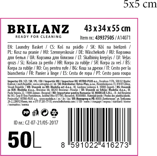 Díky kvalitnímu plastu je koš lehký, přesto odolný a snadno omyvatelný. Praktické rozměry 55 × 43 × 34 cm usnadňují umístění i v menších místnostech.