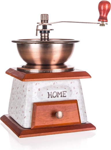 Objevte kouzlo poctivého mletí s ručním mlýnkem na kávu HOME. Dekorovaná keramika v kombinaci s dřevěnými prvky a kovovou násypkou vytváří nadčasový vzhled, který skvěle zapadne do moderních i rustikálních interiérů. Keramický mlecí mechanismus je odolný vůči opotřebení a nemění chuť kávy.
