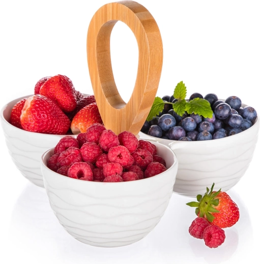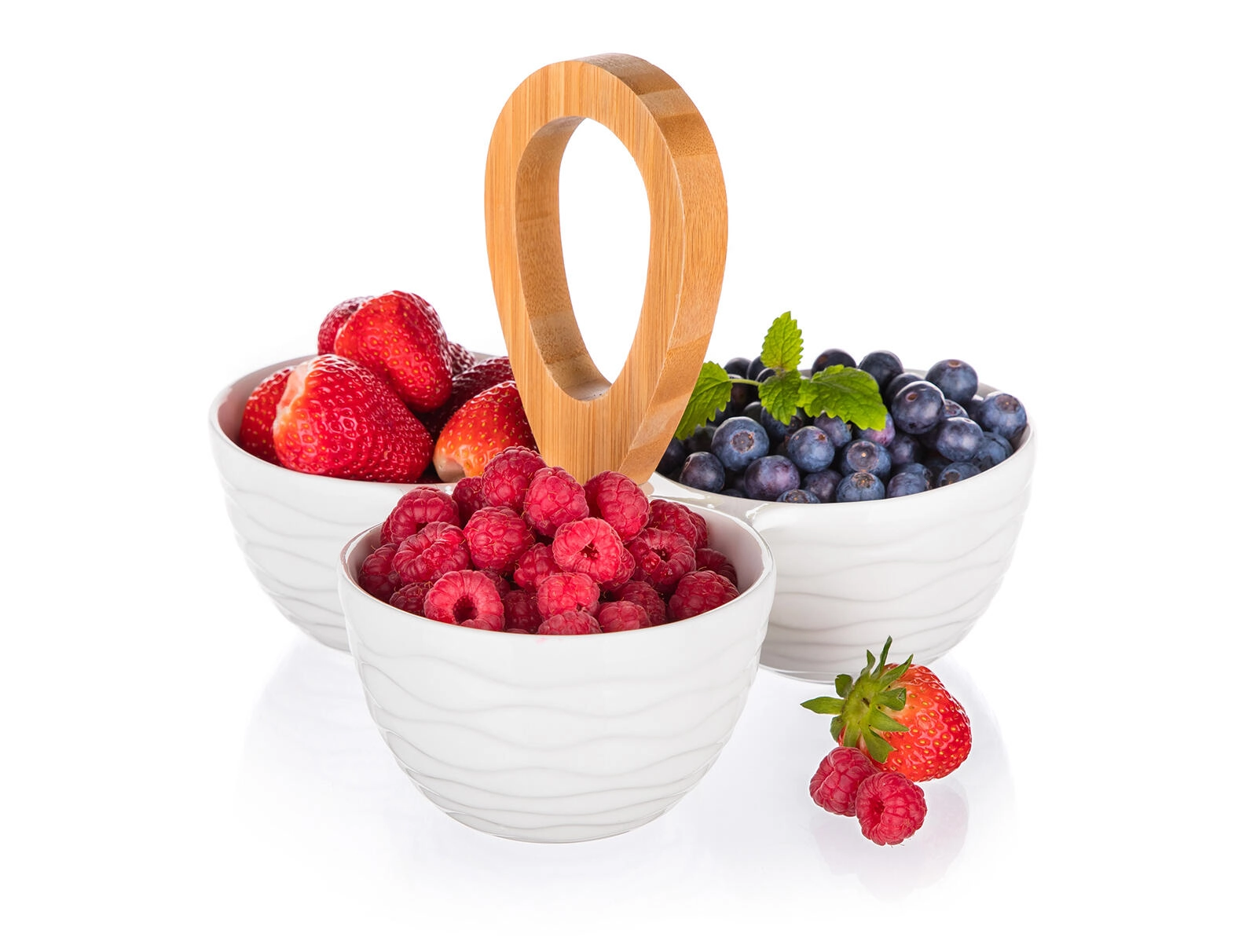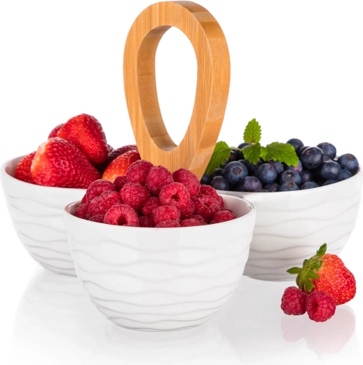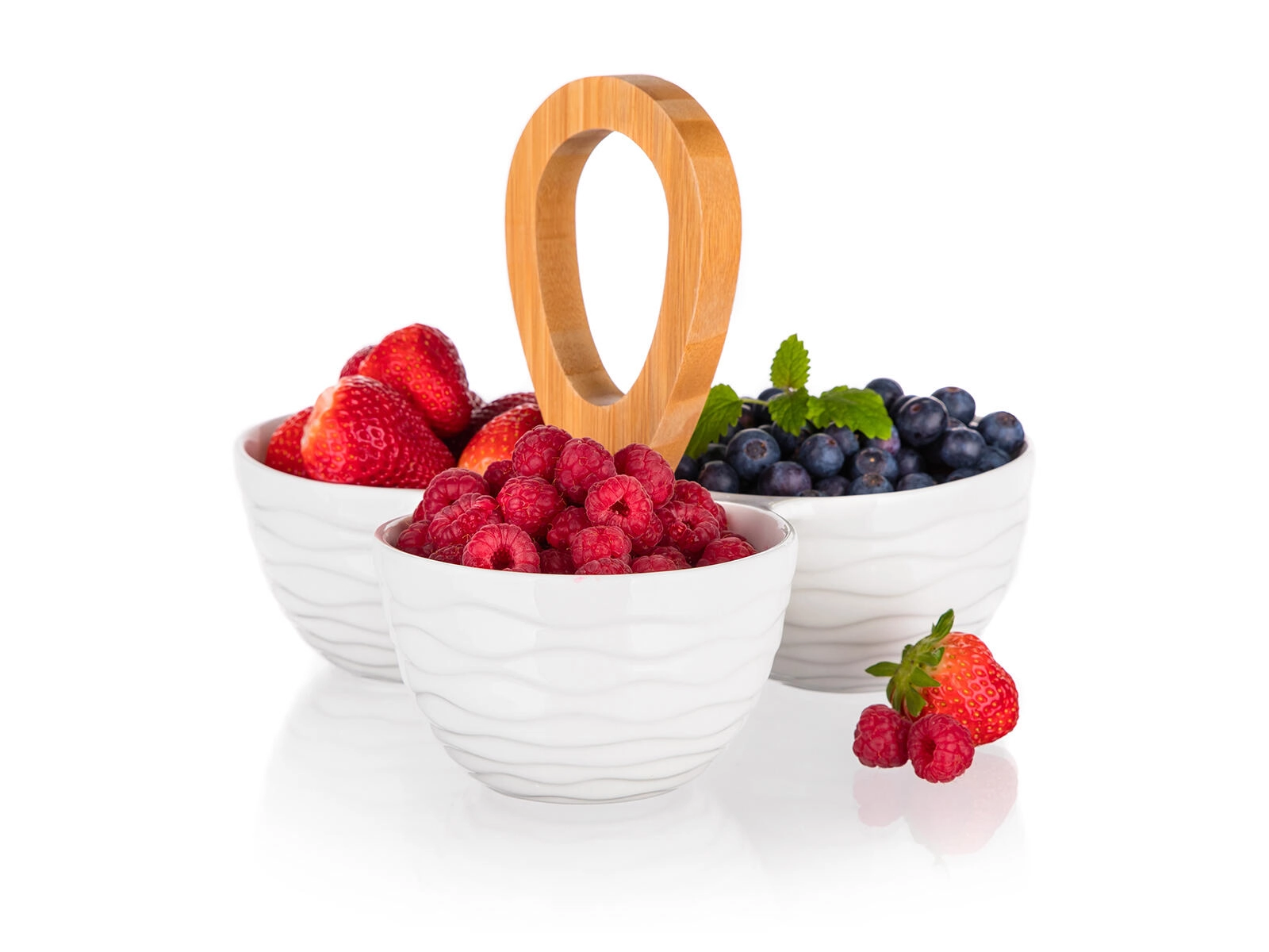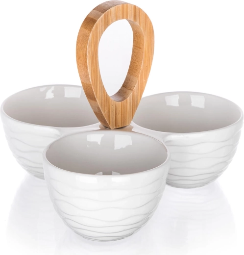 Objevte praktické a stylové řešení pro každodenní stolování i sváteční hostiny. Tři bílé porcelánové misky s jemným vlnkovým reliéfem jsou usazeny kolem pevného bambusového držadla, které usnadňuje přenášení i servírování u stolu. Set se skvěle hodí na oříšky, olivy, sušené ovoce, dipy nebo drobné sladkosti.
