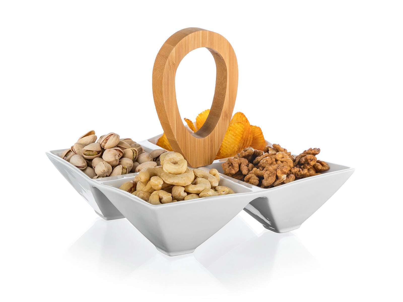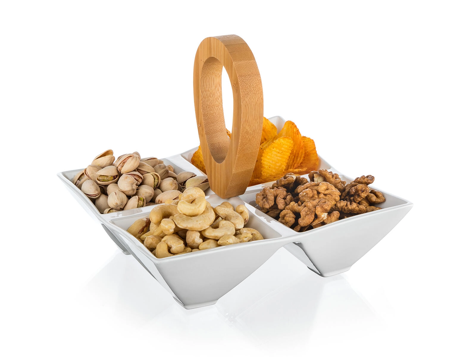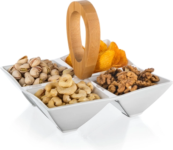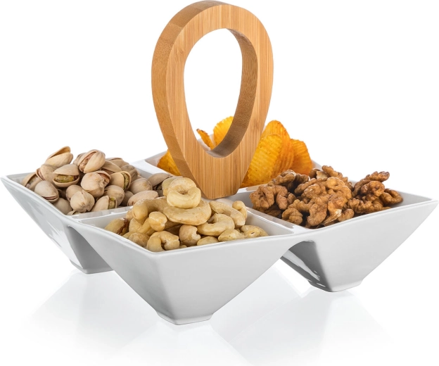 Stylová servírovací miska se čtyřmi oddělenými přihrádkami kombinuje kvalitní bílý porcelán a přírodní bambusové držadlo pro pohodlné přenášení. Ideální na oříšky, olivy, dipy i sušené ovoce, skvěle se hodí na večírky i každodenní stolování. Kompaktní rozměry 21 × 21 × 17,5 cm a moderní minimalistický design doplní každý stůl.