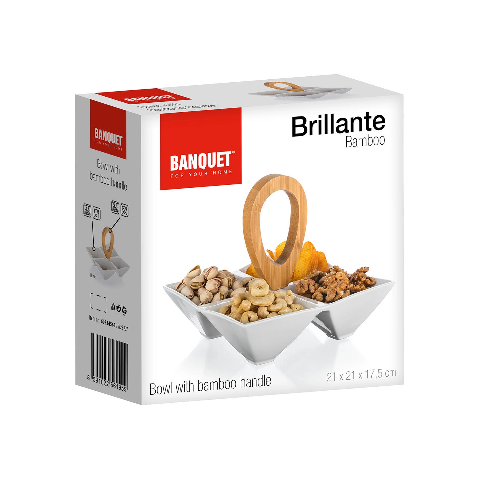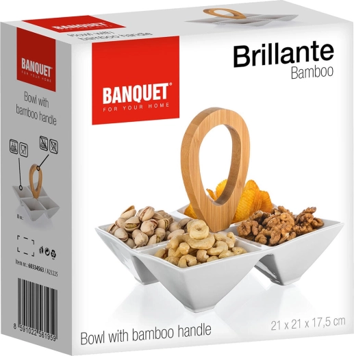 Vytvořte přehledné a elegantní servírování s dělenou miskou BRILLANTE. Čtyři hranaté porcelánové misky poskytují jasné rozdělení pro různé pochutiny, zatímco centrální bambusové držadlo zajistí bezpečné a pohodlné přenášení z kuchyně na stůl. Nadčasová bílá keramika vynikne v moderním i klasickém interiéru.