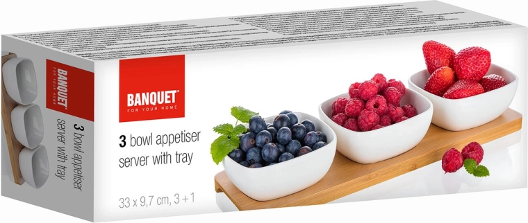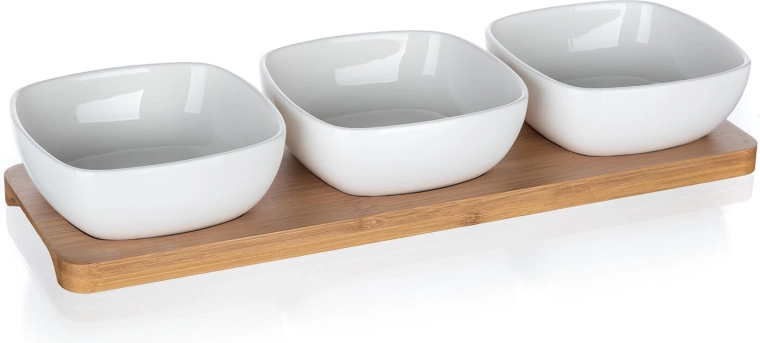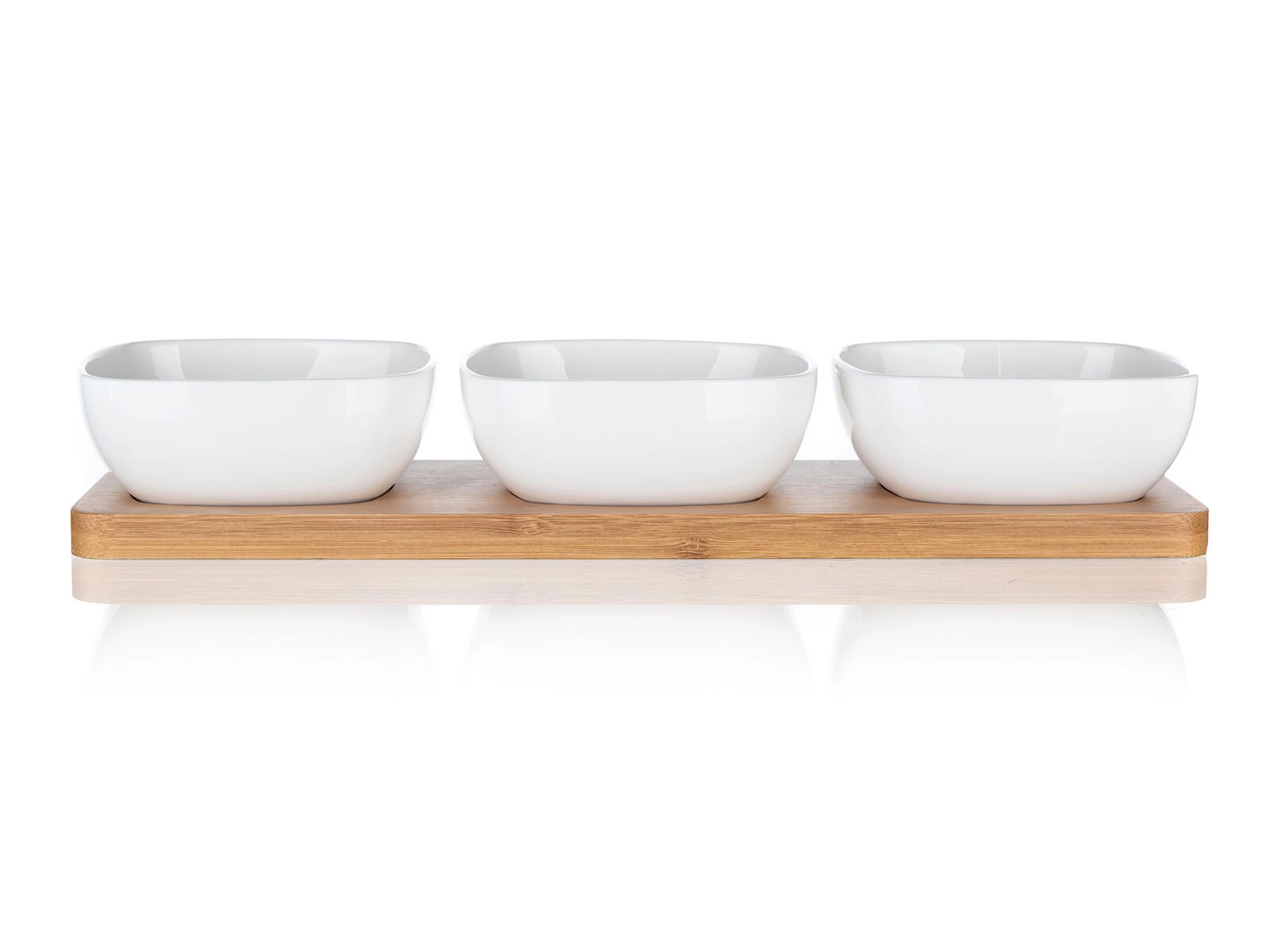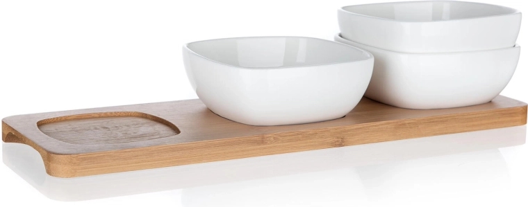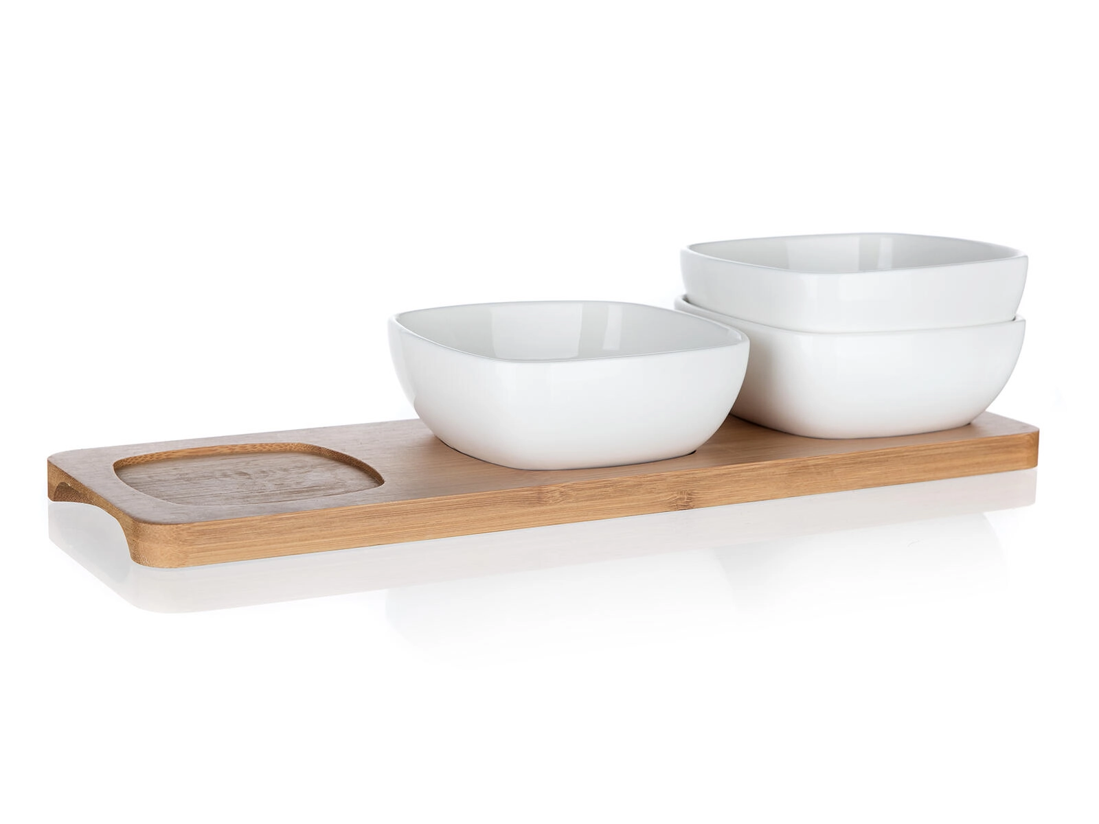 Tato kompaktní sada tří hranatých misek z kvalitního porcelánu na pevném bambusovém podnosu nabízí praktické a estetické řešení pro každodenní servírování i sváteční hostiny. Lesklý porcelán zvýrazní barvy podávaných pochoutek a přírodní bambus dodá servírování teplý, moderní akcent.