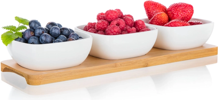 Díky promyšleným rozměrům 33 × 9,7 × 4,7 cm se sada snadno vejde na stůl nebo tác a udrží jednotlivé pochutiny odděleně. Je ideální pro dipové omáčky, snacky, koření či dezertní drobnosti.