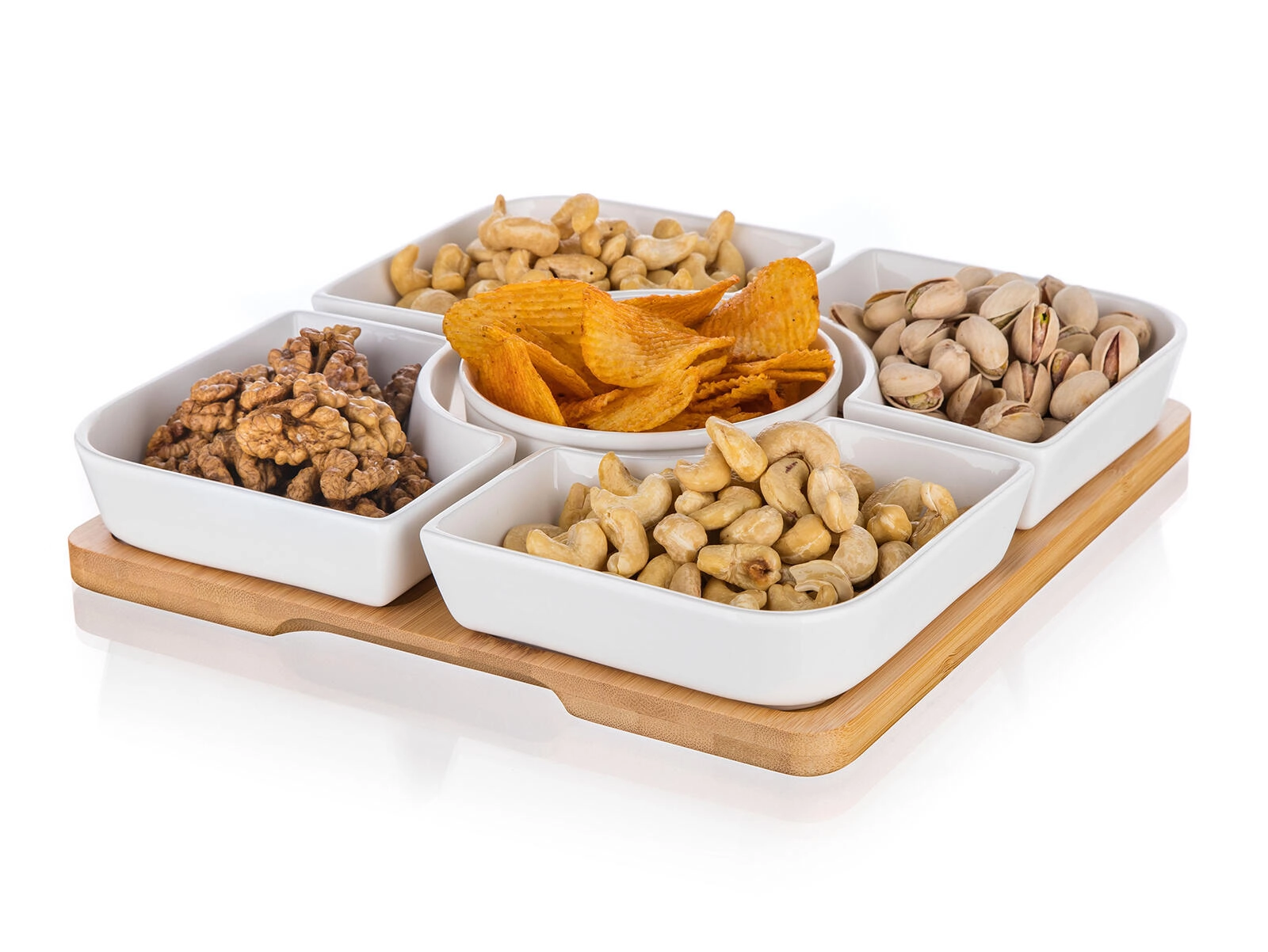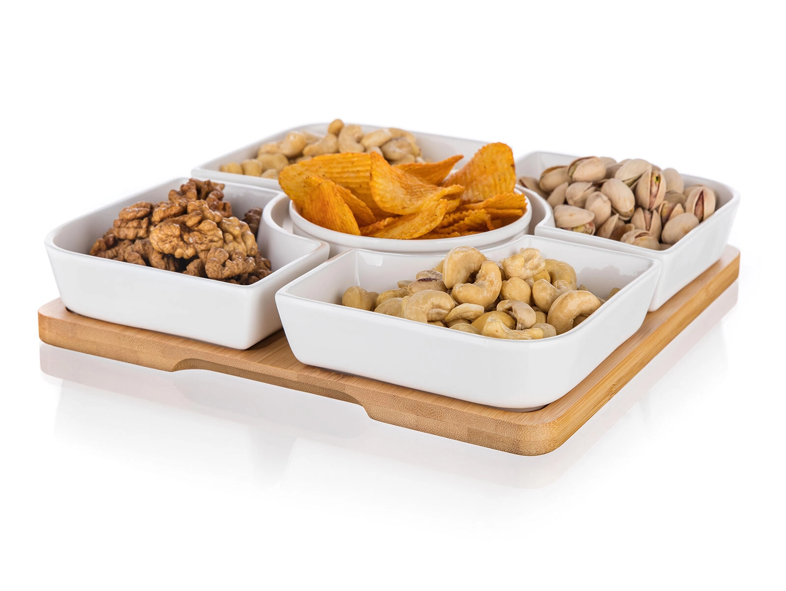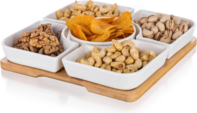 Čtyři čtvercové misky a centrální kulatá miska na bambusovém podnosu zajišťují přehledné rozdělení pochutin a lákavou prezentaci na stole.