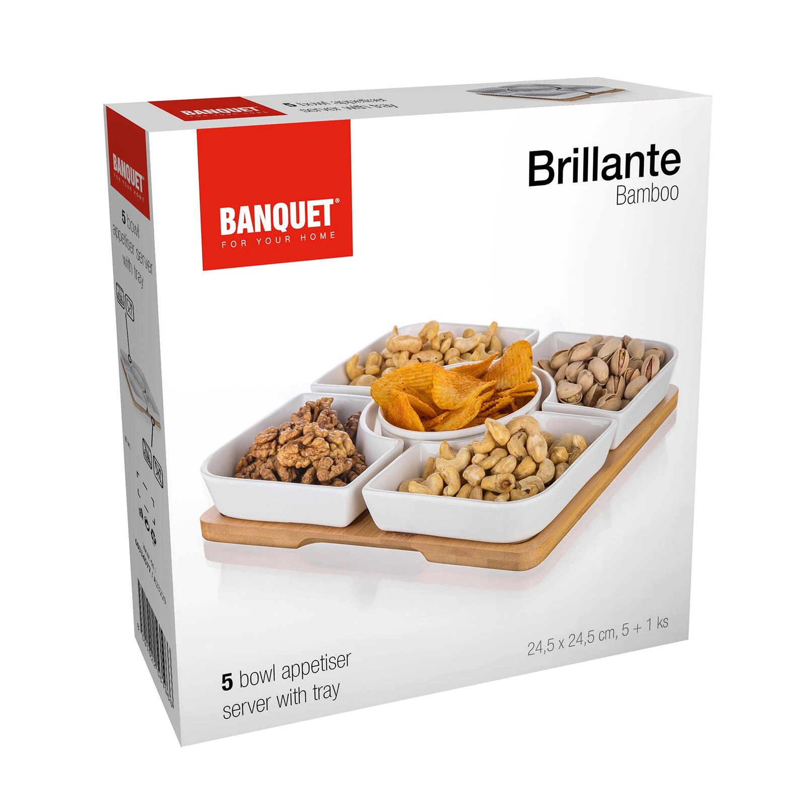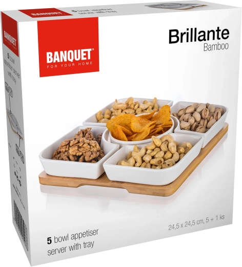 Vylaďte svoje stolování s praktickou a designovou servírovací sadou BRILLANTE. Pět bílých porcelánových misek (čtyři hranaté a jedna kulatá uprostřed) je uloženo na pevném bambusovém podnosu. Set nabízí přehledné rozdělení pochutin a skvěle se hodí na rodinné oslavy, večery s přáteli i každodenní pohoštění.