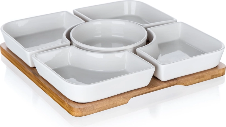 • Praktické uspořádání: čtyři čtvercové misky kolem jedné kulaté pro přehledné rozdělení pochutin.