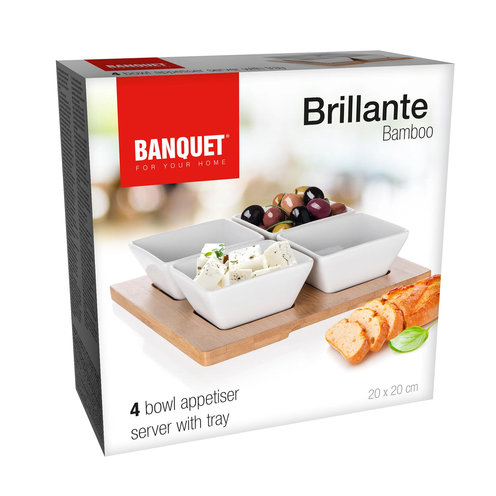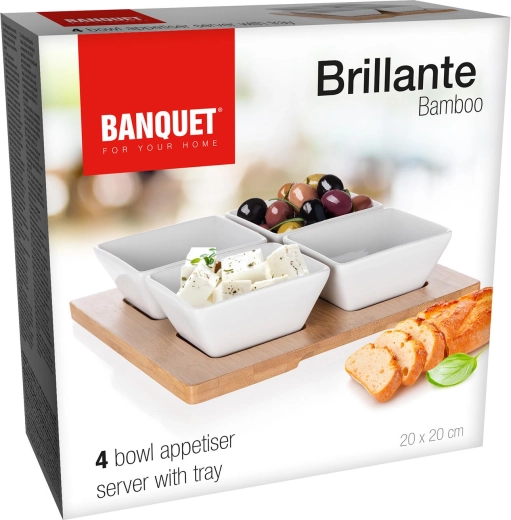 Elegantní servírovací sada BRILLANTE kombinuje porcelánové misky a bambusový tác pro stylové podávání oliv, oříšků, dipů či omáček. Kompaktní rozměr 20 × 20 cm šetří místo, zatímco hladká glazura a přírodní bambus dodávají moderní vzhled každému stolování.
