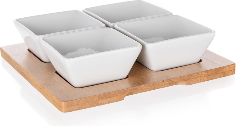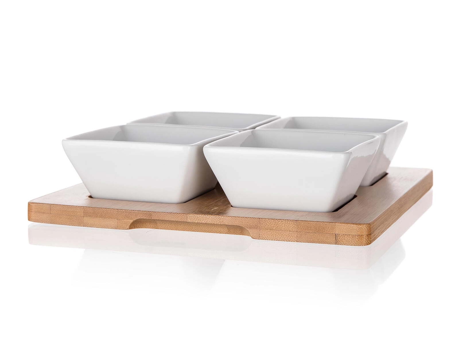 Tato 5dílná servírovací sada přináší dokonalé spojení minimalistického designu a funkčnosti. Čtyři porcelánové misky o rozměrech 8 × 8 × 4 cm jsou zasazené do stabilního bambusového podnosu, který usnadňuje přenášení a udržuje misky na místě. Ideální pro podávání drobných pochutin, tapas, dipů i dochucovadel.