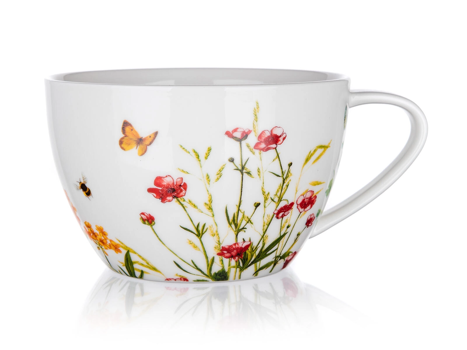 Velký keramický hrnek Jumbo Meadow (550 ml) je ideální pro každodenní chvíle pohody. Přírodní květinový motiv s motýlkem a včelkou dodá servírování jedinečný šarm a snadno se kombinuje s dalšími kousky ve stejném dekoru.
