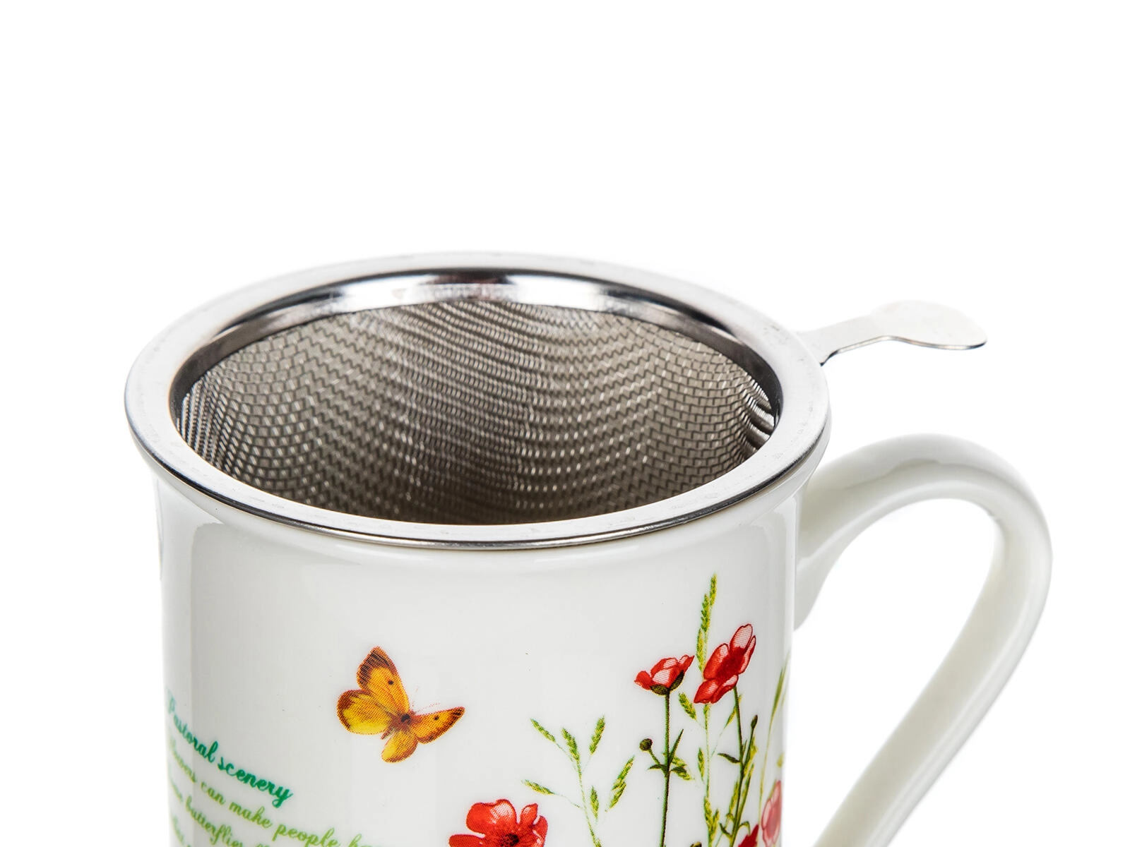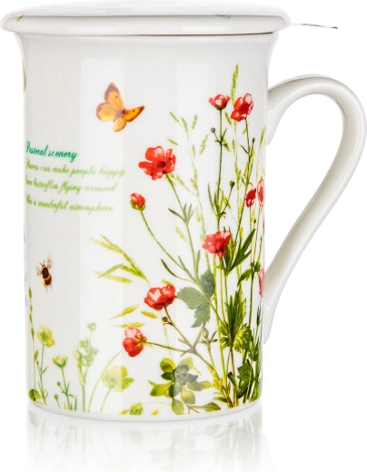 Stylový hrnek MEADOW FLOWERS přináší kombinaci půvabu a funkčnosti. Díky nerezovému sítku s jemnou síťovinou připravíte svůj oblíbený sypaný čaj přímo v hrnku, zatímco keramické víčko udrží nápoj déle teplý. Po louhování víčko poslouží jako praktický podtácek pro odložení sítka.