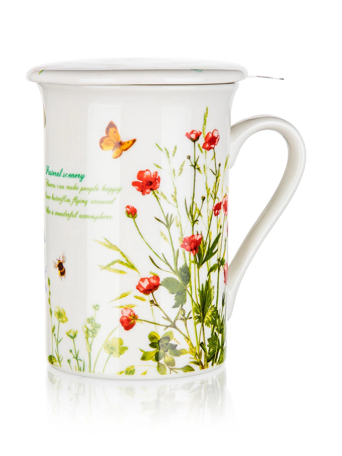 Decentní motiv lučních květin z hrnku dělá elegantní doplněk pro domácnost i kancelář – ideální jako dárek pro milovníky čaje.