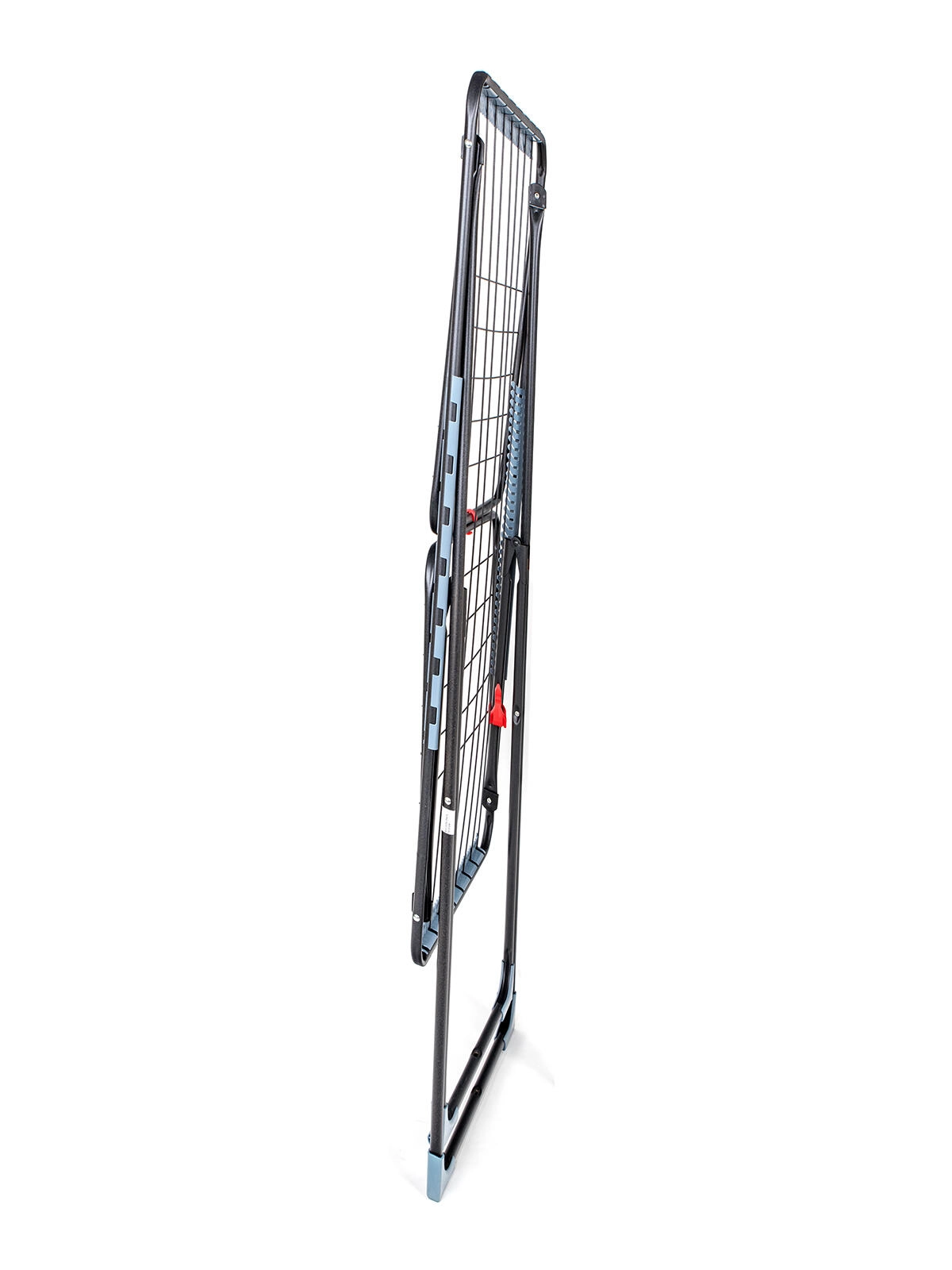 Stabilní X-konstrukce z kovu s plastovými prvky v elegantní antracitové barvě je odolná a snadno se skládá i přenáší. Dvě kolečka usnadňují manipulaci po bytě i na balkóně. Protiskluzové koncovky a aretační prvky zvyšují bezpečnost a stabilitu při plném zatížení.