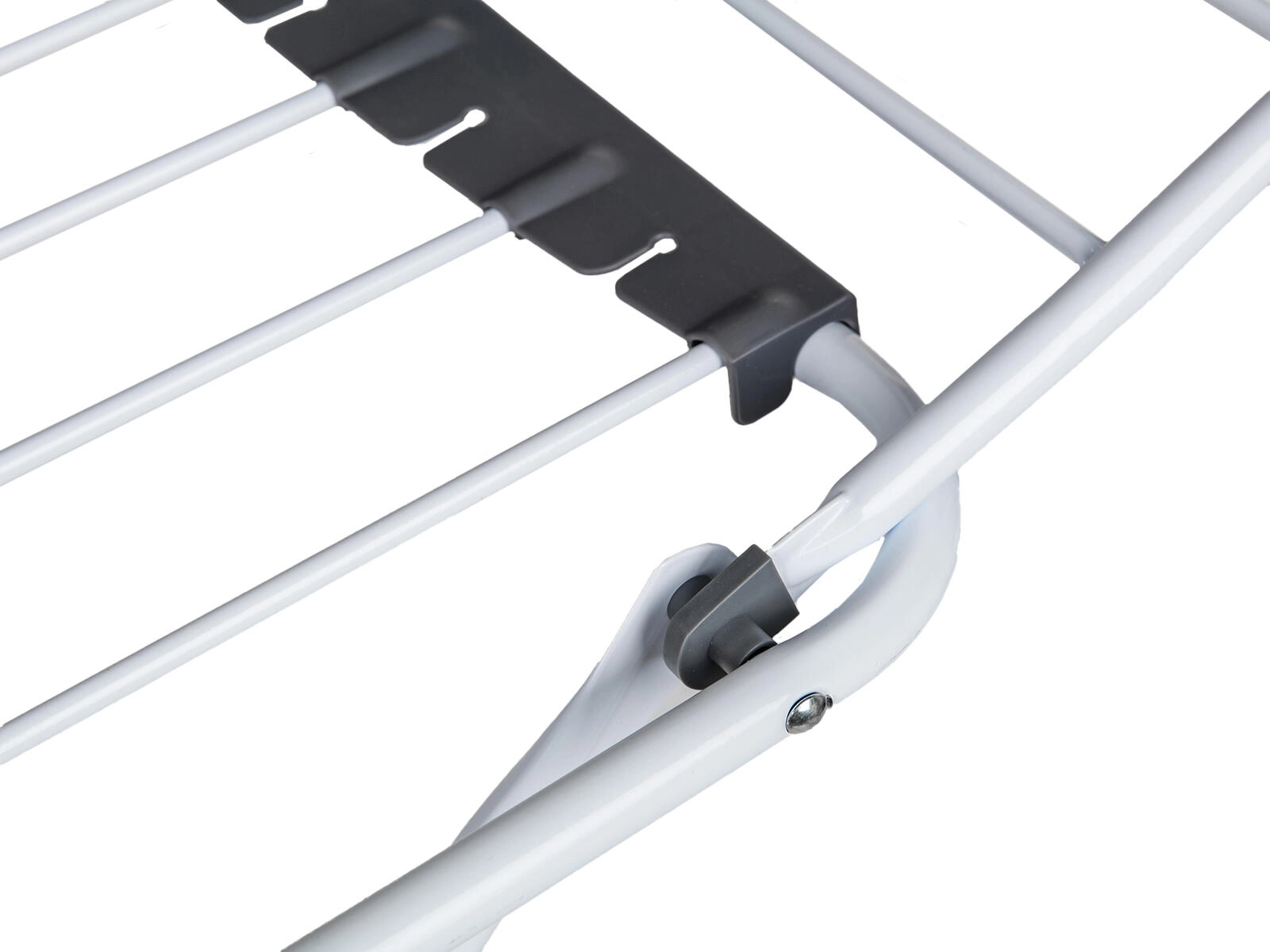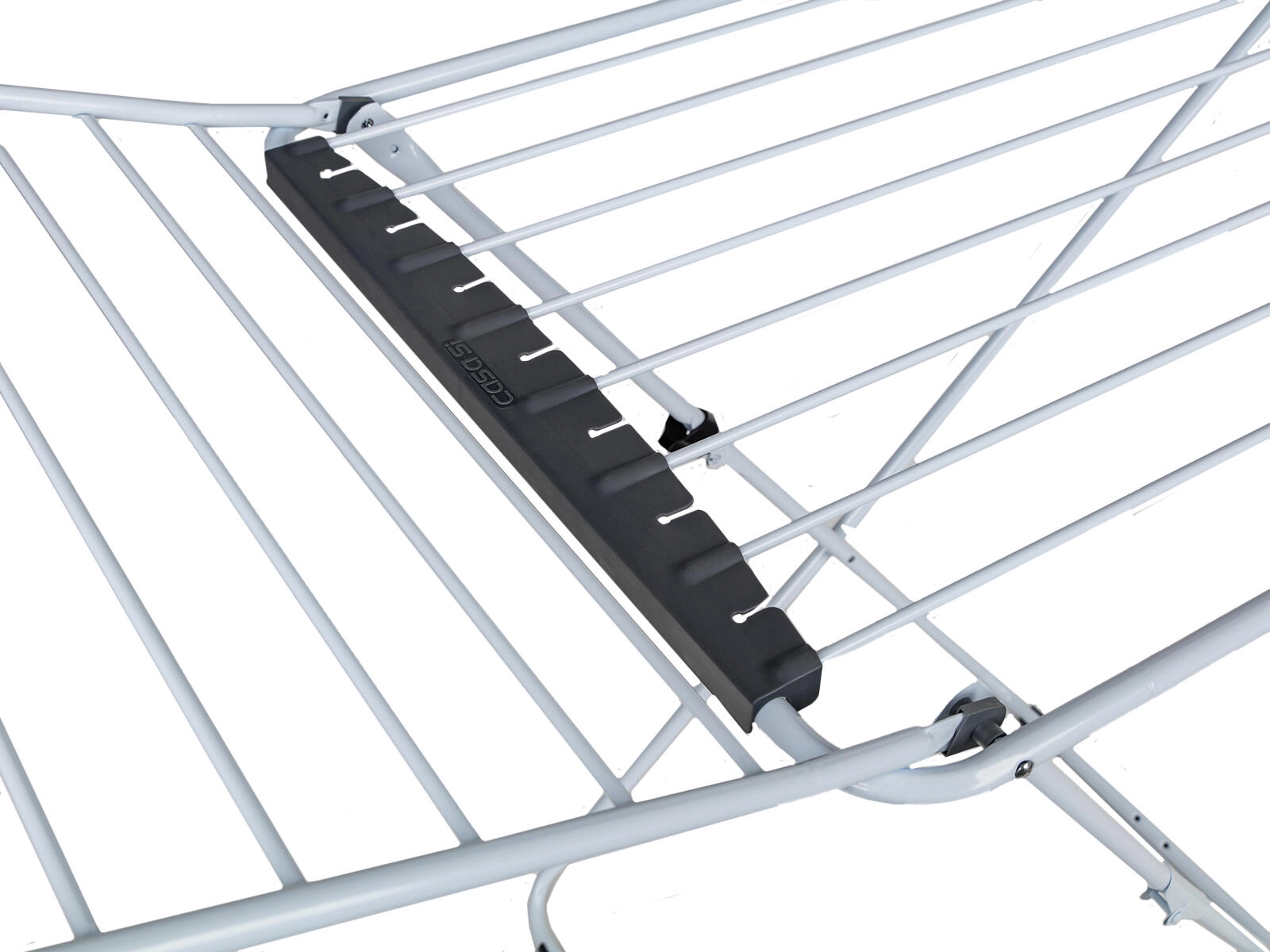Robustní kovová konstrukce s odolnými plastovými držáky ve stabilním X-rámu zajišťuje pevnost a bezpečné používání. Nechybí dětský bezpečnostní zámek, který omezuje náhodné složení sušáku, a praktický držák na ponožky a drobné prádlo pro rychlé věšení bez kolíčků.