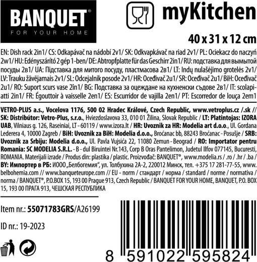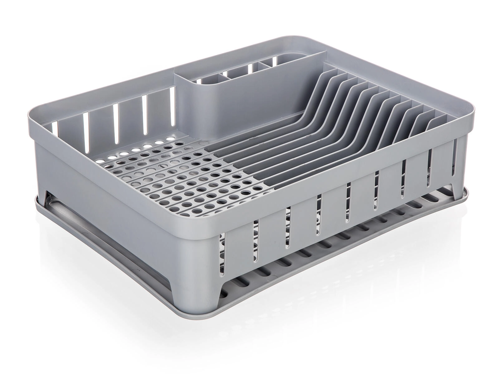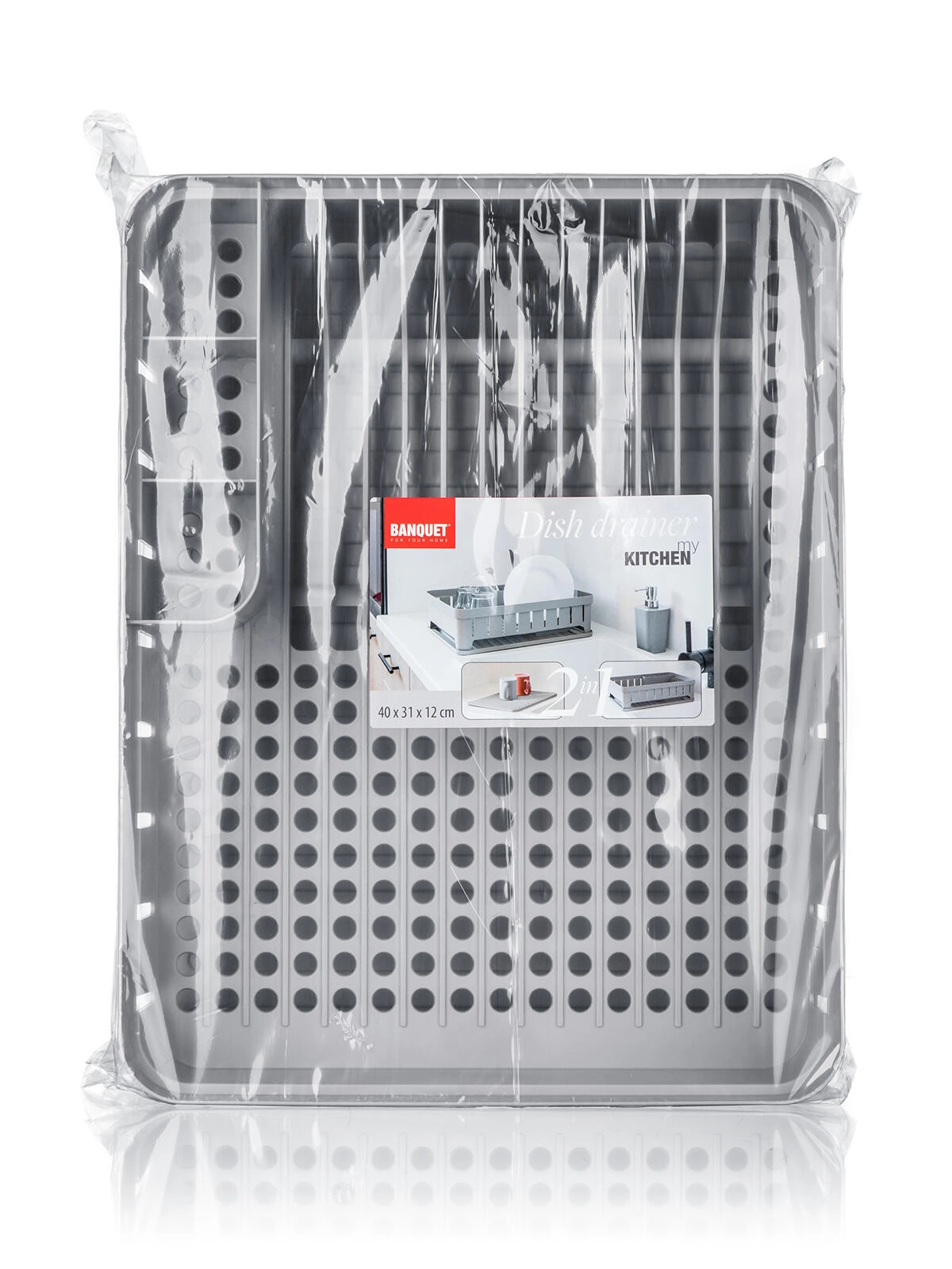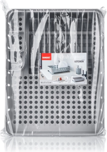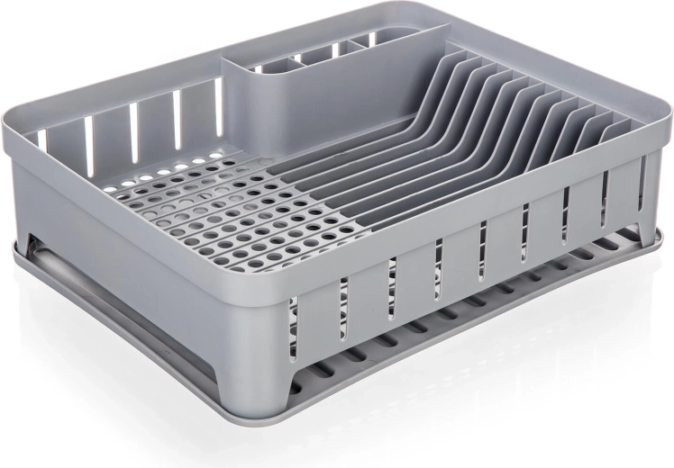 Praktický odkapávač na nádobí s podnosem ve šedé barvě nabízí rozměr 40 × 31 × 12 cm, takže poskytne dostatek místa pro každodenní mytí nádobí. Disponuje oddělenými sekcemi na příbory, talíře a ostatní nádobí, díky čemuž je sušení přehledné a rychlé. Odolný plast se snadno čistí a podnos zachytí odkapávající vodu, aby zůstal kuchyňský pult čistý a suchý.