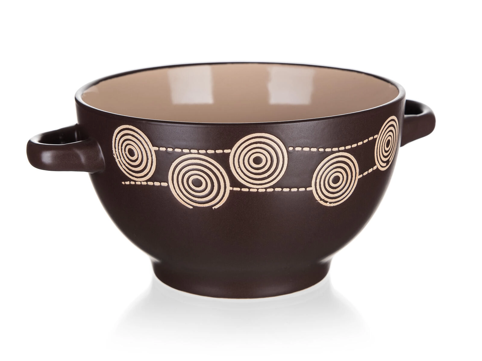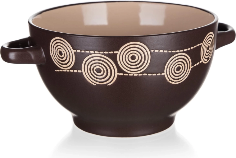 Stylová keramická miska s uchy a dekorem Spirála v tmavě hnědé barvě je ideální pro servírování polévek, müsli či těstovin. Nabízí objem 660 ml, je odolná a snadno udržovatelná – lze ji používat v mikrovlnné troubě a mýt v myčce na nádobí. Praktický průměr 13,5 cm a pohodlná ucha zajišťují snadné přenášení i každodenní komfort.