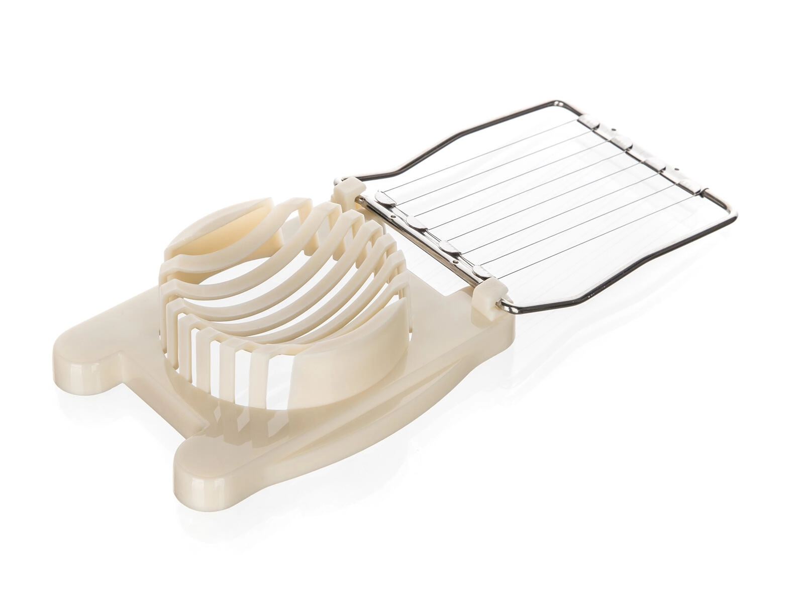 Elegantní krémový kráječ na vejce kombinuje praktický design a rychlou obsluhu. Stabilní základna s tvarovanou kolébkou pevně fixuje vejce, zatímco hustě rozložené nerezové struny zajistí čisté a stejnoměrné řezy bez mačkání. Ideální pro vejce do salátů, sendvičů či dekorativní servírování.