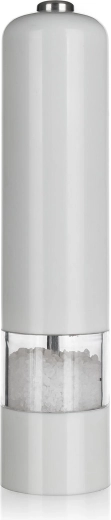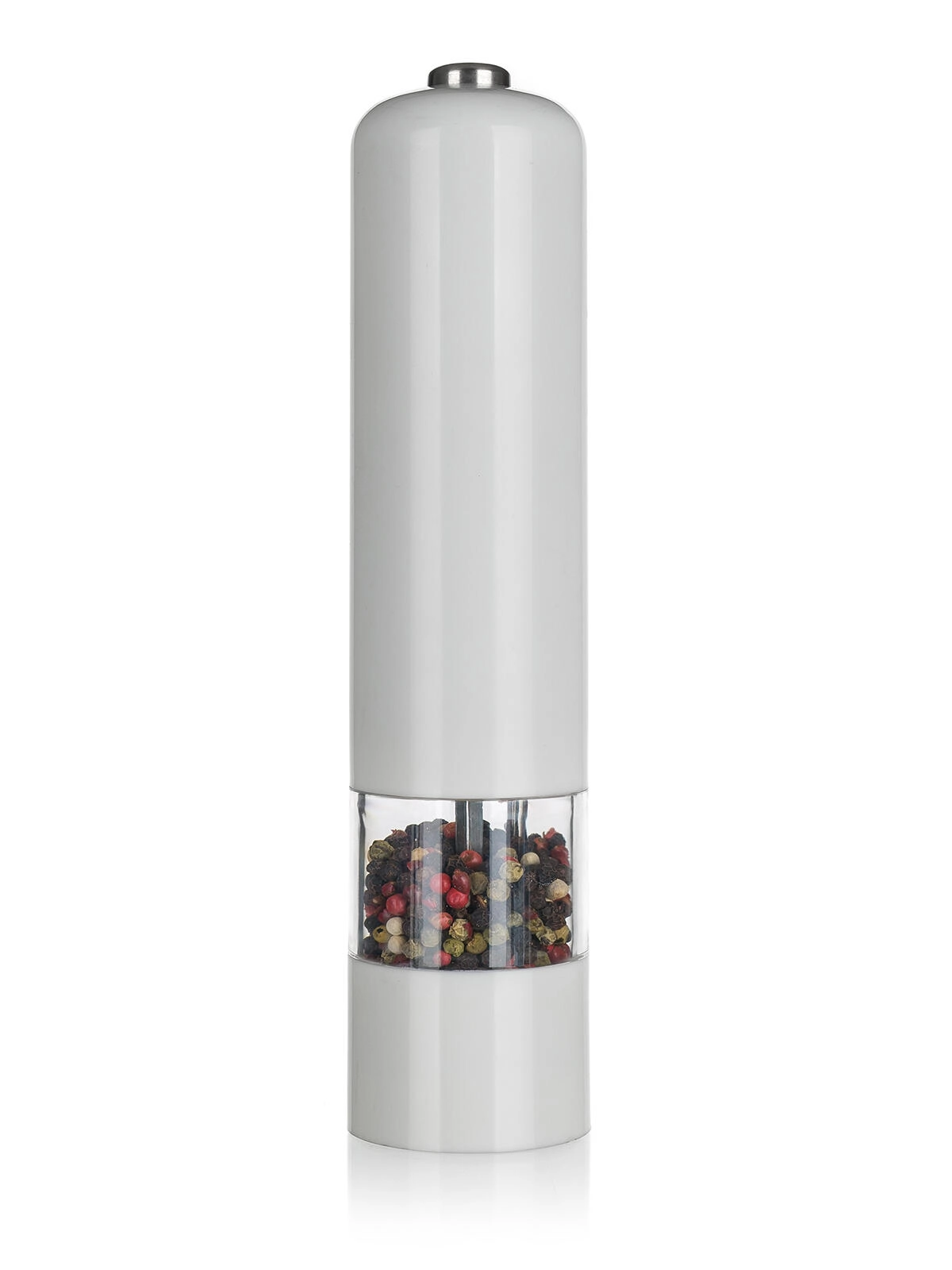 Stylový elektrický mlýnek na koření s výškou 22,8 cm kombinuje moderní design a pohodlné ovládání jednou rukou. Díky keramickému mlecímu mechanismu si vychutnáte přesné a rovnoměrné mletí. Průhledný akrylový zásobník umožňuje kontrolu hladiny koření a odolné provedení z ABS, kovu a akrylu zaručuje dlouhou životnost. Napájení zajišťují 4× AA baterie (nejsou součástí balení).